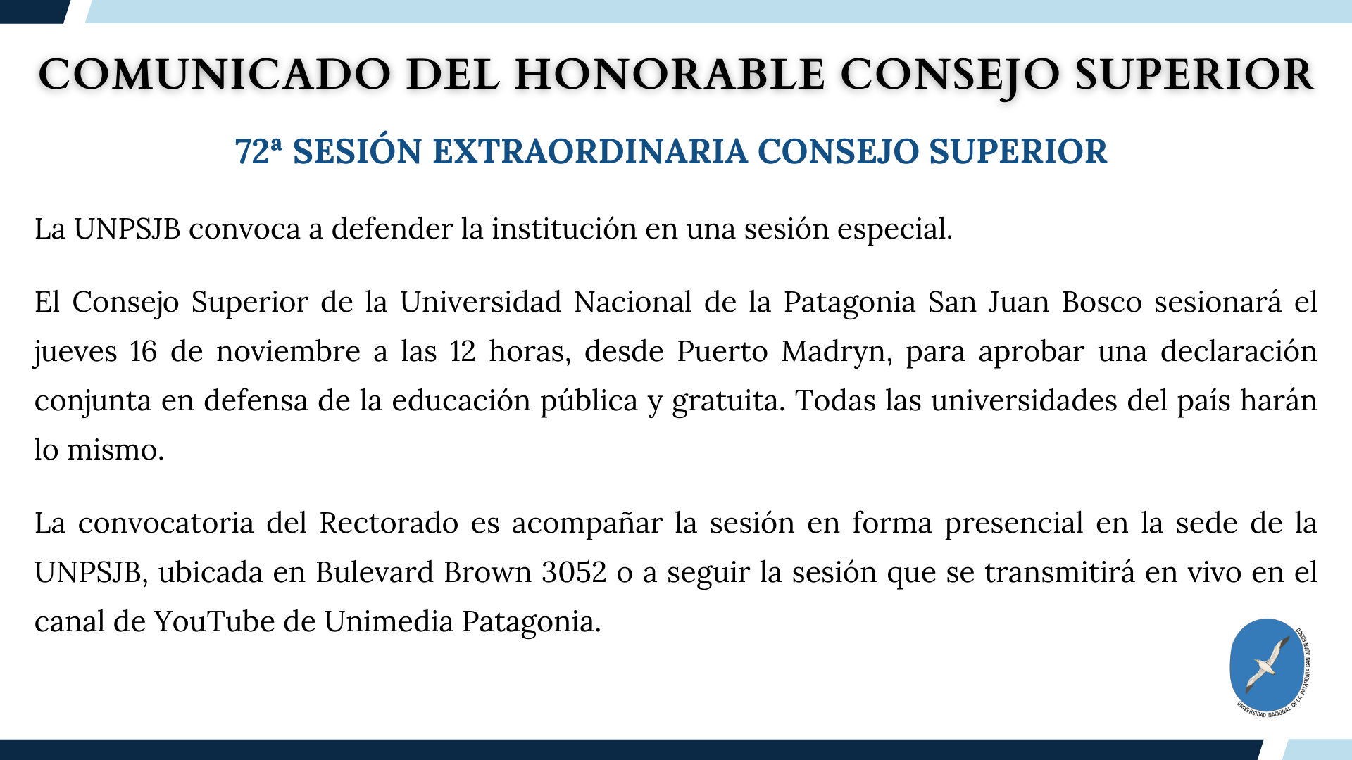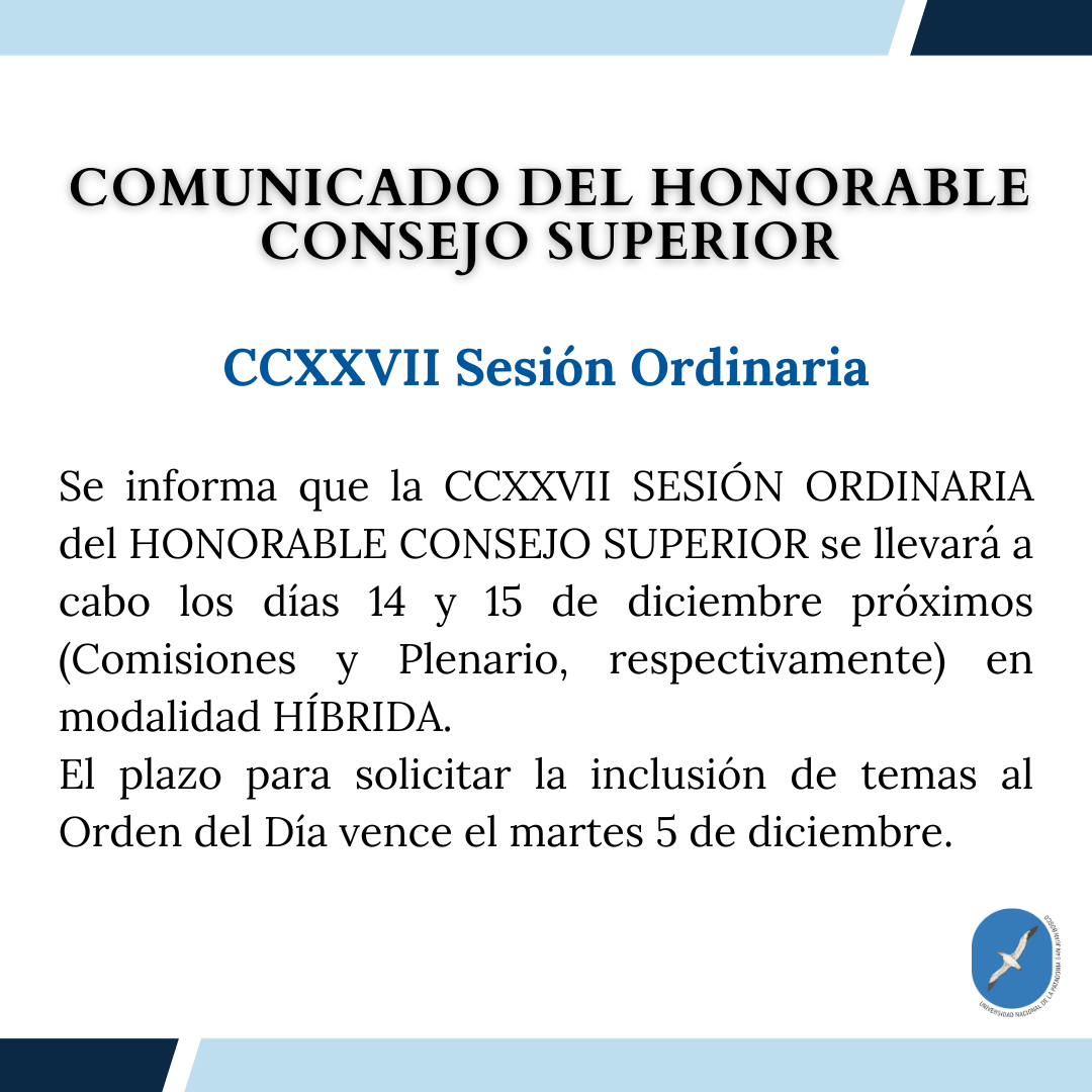 72ª Sesión Extraordinaria Consejo Superior UNPSJB Publicado el Jueves, 16 Noviembre 2023 13:34 Categoría: En vivo Visitas: 922