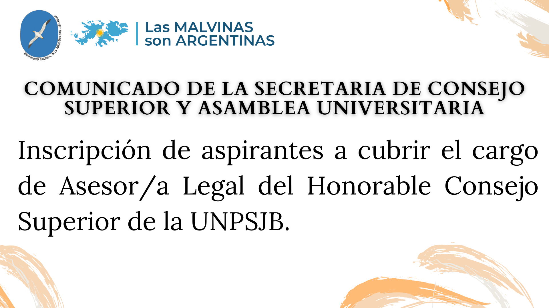 Se llama a inscripción de aspirantes a cubrir el cargo de Asesor/a Legal del Honorable Consejo Superior de la Universidad Nacional de la Ptagonia San Juan Bosco.