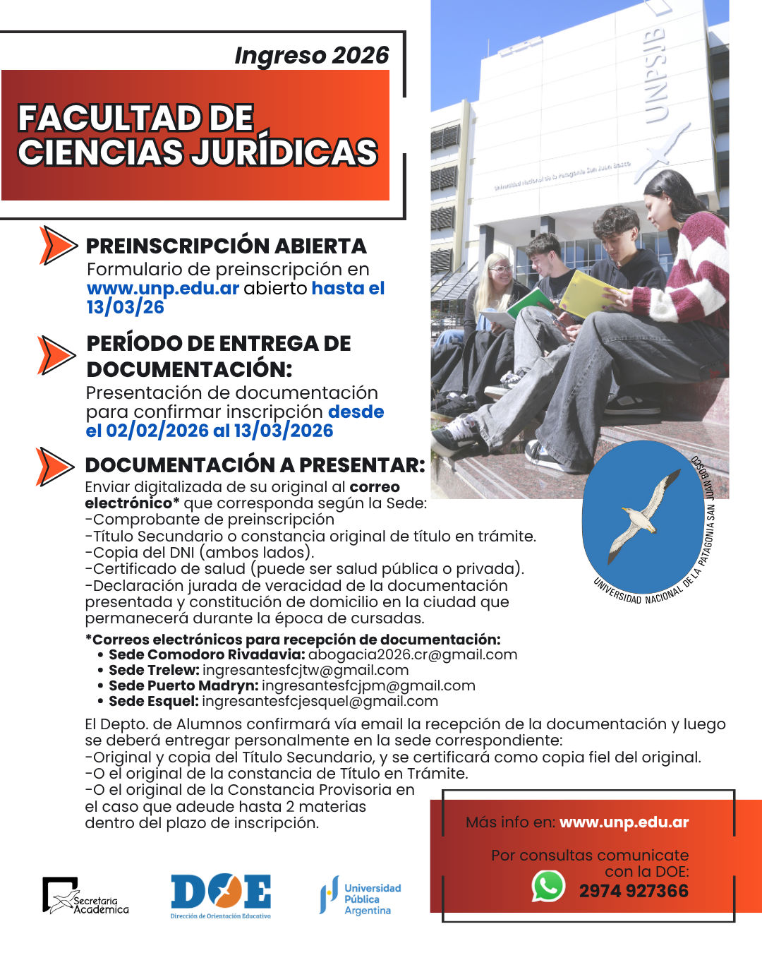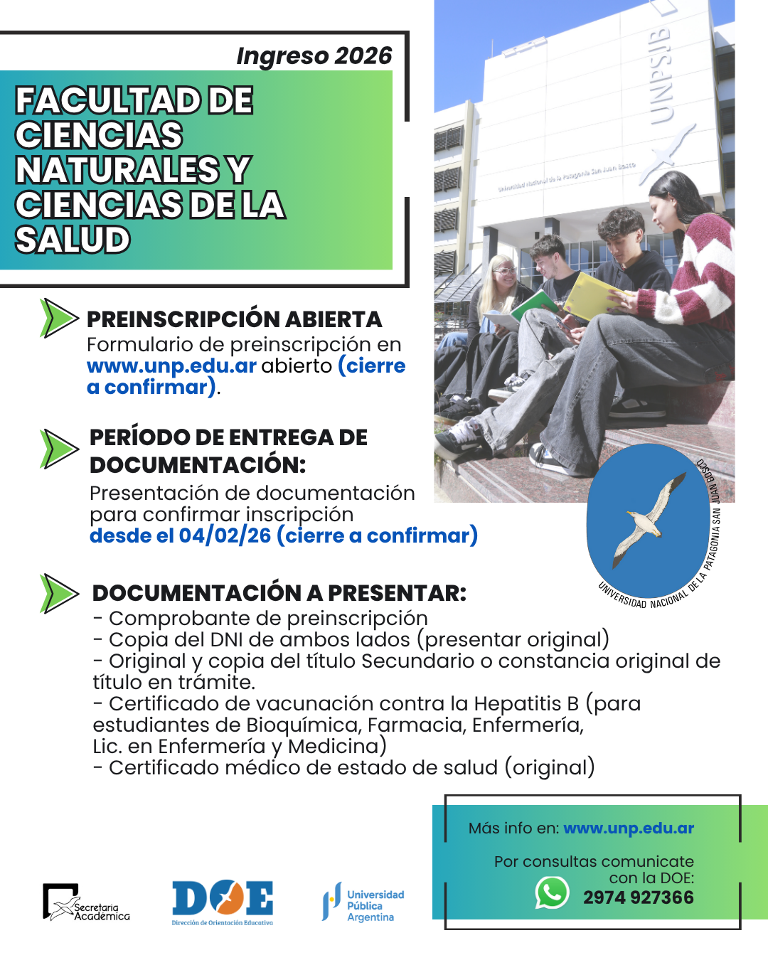 - Por consultas relacionadas a información de carreras e inscripciones comunicarse con la Dirección de Orientación Educativa al WhatsApp 297 4927366.