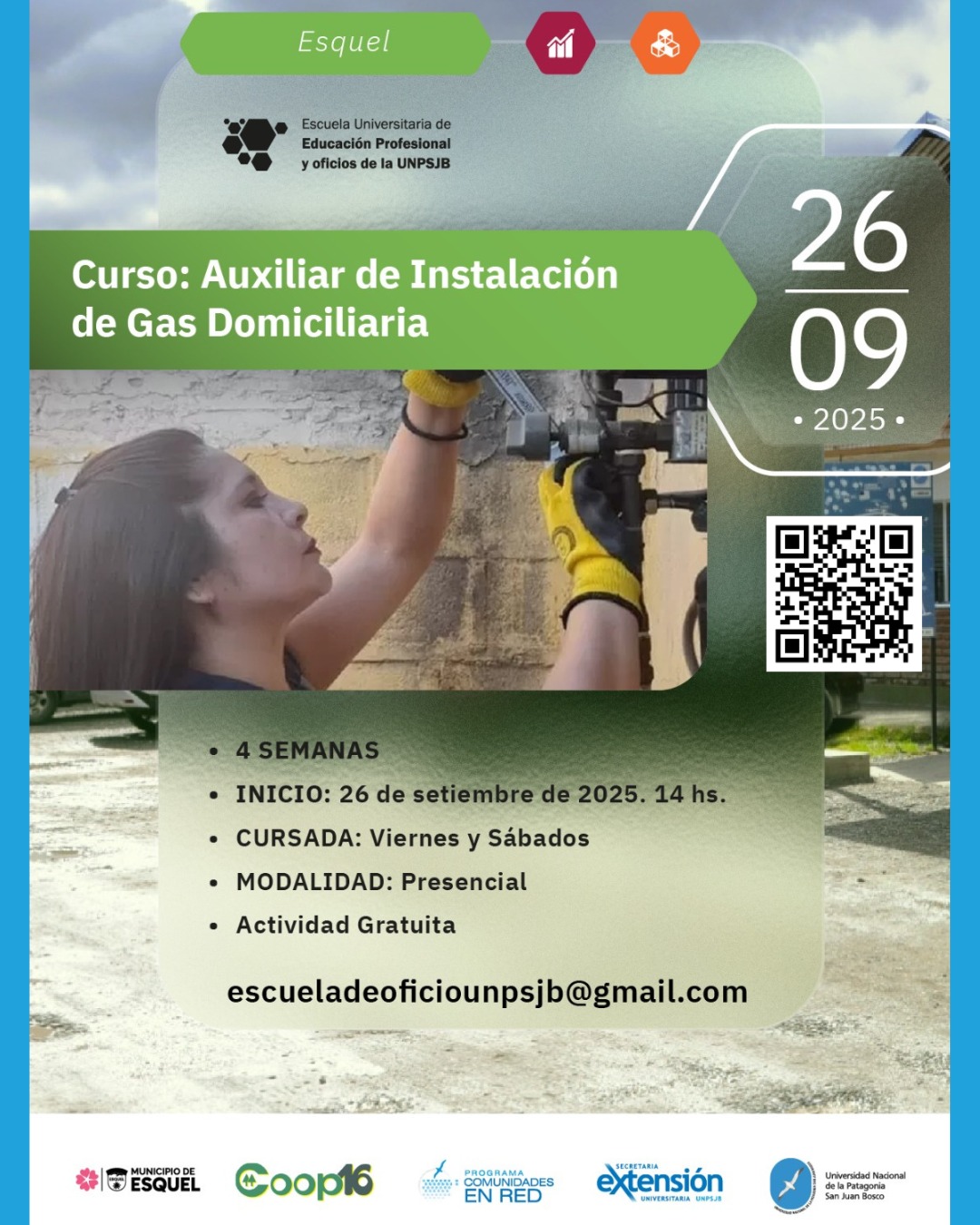 La Universidad Nacional de la Patagonia San Juan Bosco, a través de la Escuela Universitaria de Educación Profesional y Oficios, anuncia la apertura del curso Auxiliar en Instalaciones de Gas Domiciliarias, que se dictará en la ciudad de Esquel con modalidad presencial y certificación universitaria.
