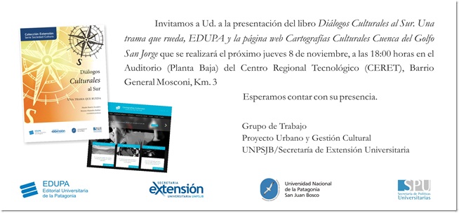 Desde la Universidad nacional de la Patagonia San Juan Bosco se presentará el libro Diálogos culturales al Sur. Una trama que rueda, y Cartografía Cultural Cuenca del Golfo San Jorge,  el próximo jueves 8 de noviembre a las 18:00 en el Auditorio del CERET, barrio General Mosconi, Km. 3.