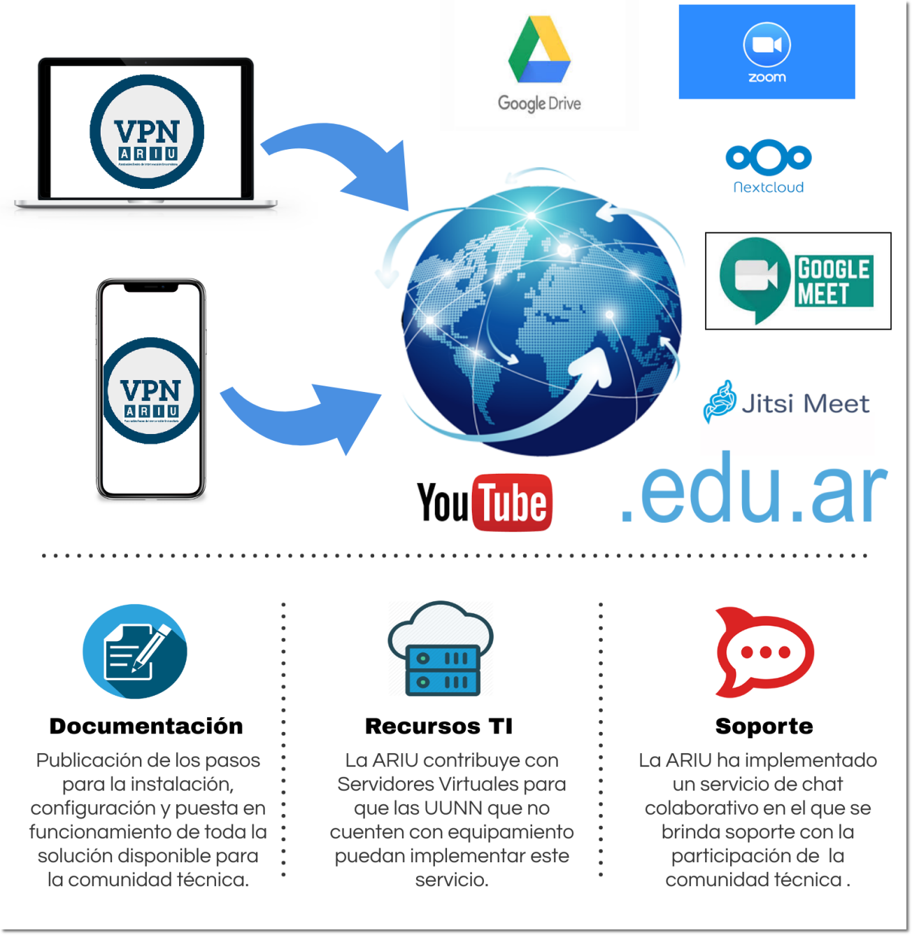 Recordemos que ARIU implementó un servicio a las Universidades Nacionales para declarar una cantidad de usuarios autenticados a los cuales se les permitirá el acceso sin costo a una red privada virtual (VPN) y de allí facilitar acceso a contenidos digitales a través de teléfonos móviles.