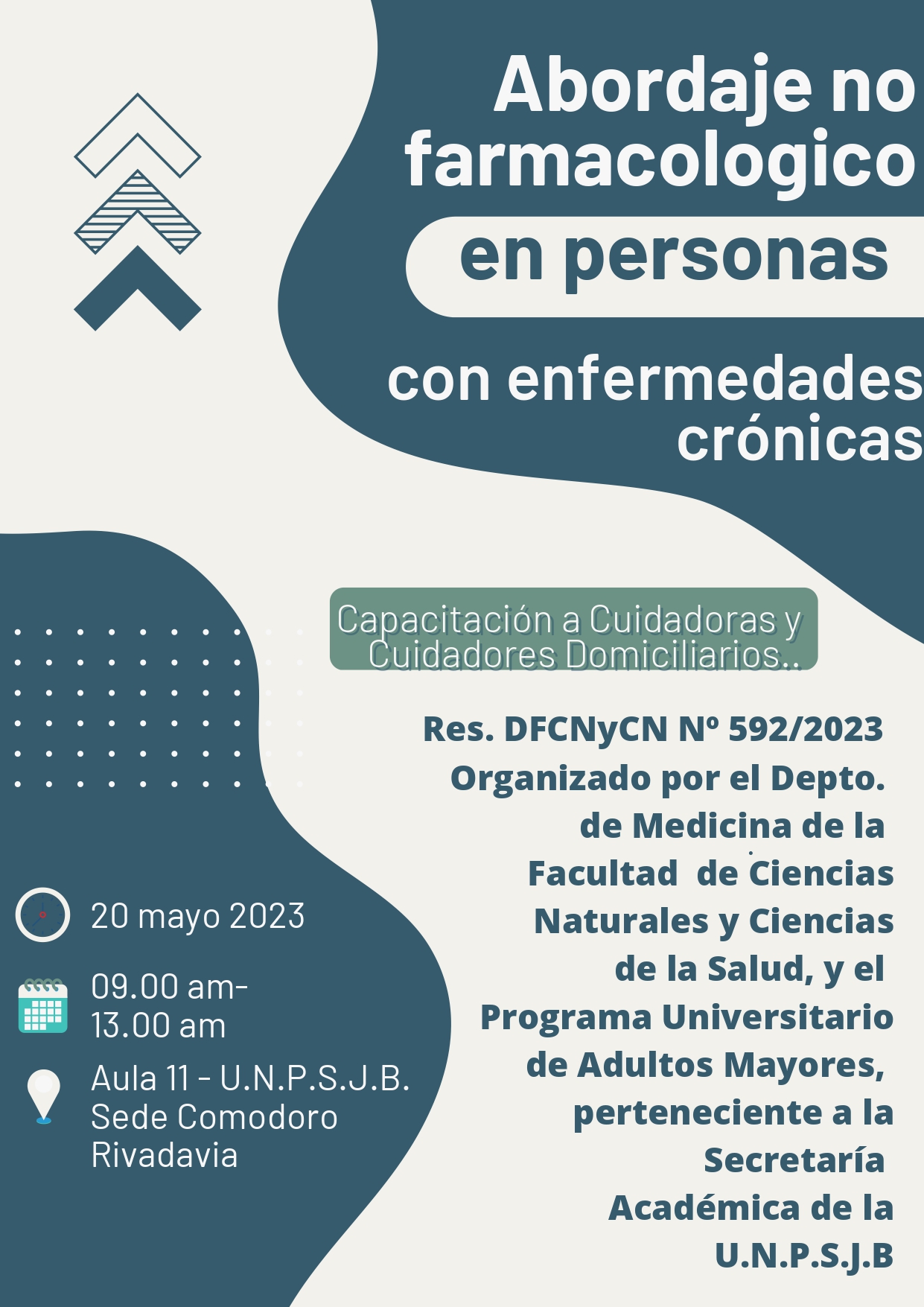 La Universidad Nacional de la Patagonia San Juan Bosco, en el marco del Programa Universitario de Adultos Mayores, de la Secretaria Académica del Rectorado, y en articulación con la Facultad de Ciencias Naturales y de la Salud organizan la capacitación Abordaje no farmacológico en personas con enfermedades crónicas. La actividad estará a cargo del Departamento de la Carrera de Medicina, y el Centro de Salud Solanas. Se trata de una jornada de capacitación con diferentes representantes y catedráticos de la salud de Comodoro Rivadavia.