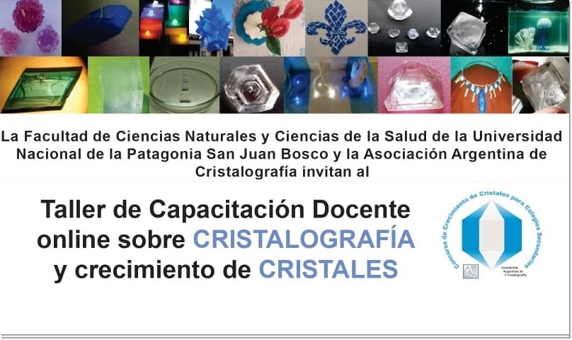 La Facultad de Ciencias Naturales y Ciencias de la Salud de la UNPSJB y la Sociedad Argentina de Cristalografía, invitan a participar del Taller de Capacitación online de Cristalografia y crecimiento de los cristales. A cargo del taller estarán el Dr. Sebastián Klinke (CONICET-Leloir) y Prof. Adriana Mangani (UNPSJB). Será también un espacio para la difusión del Concurso Nacional de Crecimiento de Cristales para Colegios Secundarios de la Asociación Argentina de Cristalografía.La capacitación se realizará el lunes 29 de junio de 16.00 a 20.30, en directo para docentes de la Provincia de Chubut.