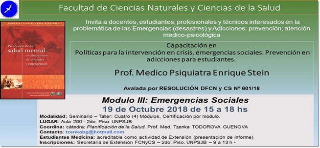 Facultad de Ciencias Naturales y Ciencias de la Salud presenta la Capacitación en políticas para la intervención en crisis, emergencias sociales y en prevención en adicciones dictado por el docente Prof. Médico Psiquiatra Enrique Stein.