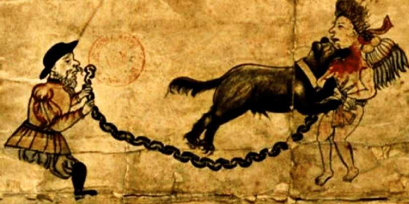 El fraile Bernardino de Sahagún describe en sus crónicas que los indios eran atacados por “perros enormes, con orejas cortadas, ojos de fiera color amarillo inyectados en sangre, enormes bocas, lenguas colgantes y dientes en formas de cuchillos, salvajes como el demonio”.