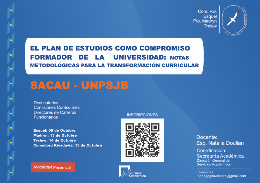 Próximamente se brindará una nueva instancia de capacitación presencial en las cuatro sedes en el marco de la implementación del Sistema Argentino de Créditos Académicos Universitarios (SACAU) en la UNPSJB. Este curso se titula "El plan de estudios como compromiso formador de la Universidad: notas metodológicas para la transformación curricular" y estará a cargo de la Esp. Natalia Doulián.