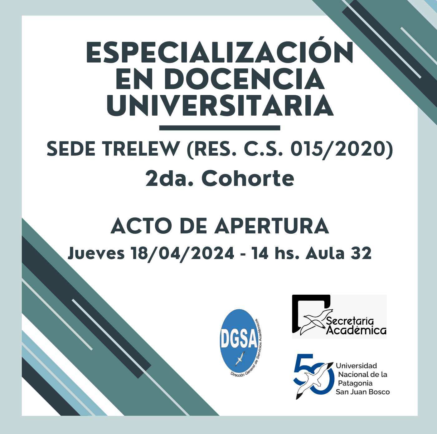 El próximo 18 de abril en la Sede Trelew de nuestra Universidad se dará comienzo a una nueva cohorte del Posgrado Especialización en Docencia Universitaria que coordina la Dirección General de Servicios Académicos (DGSA), perteneciente a la Secretaría Académica de la UNPSJB. El Acto contará con la presencia de autoridades de la universidad, estudiantes e integrantes del Cuerpo Académico de la carrera.