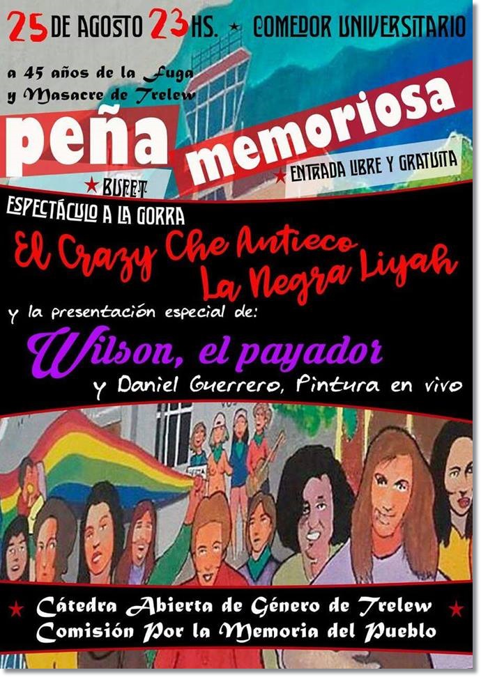 La Cátedra Abierta de Género Trelew y la Comisión por la Memoria del Pueblo tienen el agrado de invitar a toda la comunidad a la “Peña Memoriosa”, a realizarse el día viernes 25 de agosto, a partir de las 23:00 hs en el comedor universitario Luis Yllana (sito en Fontana y 9 de Julio Trelew).