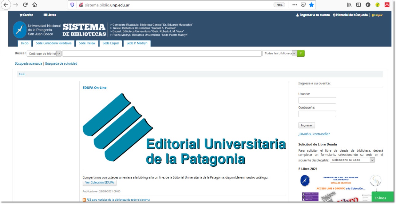 Desde el catálogo en línea del Sistema de Bibliotecas de la UNPSJB ya se puede acceder a la bibliografía que la Editorial Universitaria de la Patagonia (EDUPA) dispone en formato digital, de libre acceso.