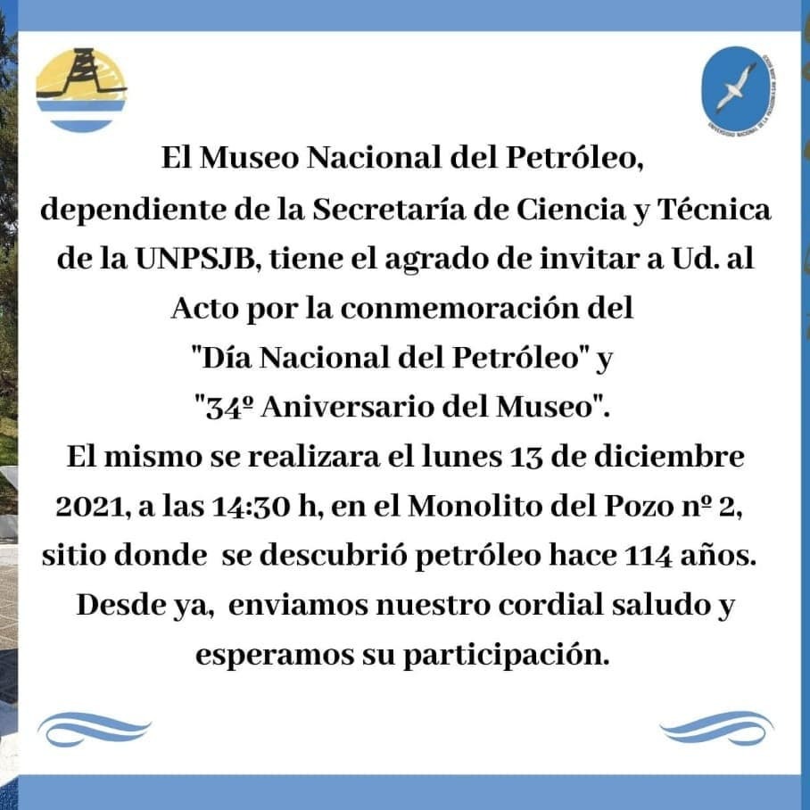 El Museo Nacional del Petróleo, dependiente de la Secretaría de Ciencia y Técnica de la UNPSJB, invita a la comunidad a participar del programa de actividades que se desarrollará en el marco del 114° Aniversario del Descubrimiento del Petróleo y el 34° Aniversario de la institución. Durante la jornada, la entrada al museo será totalmente libre y gratuita.