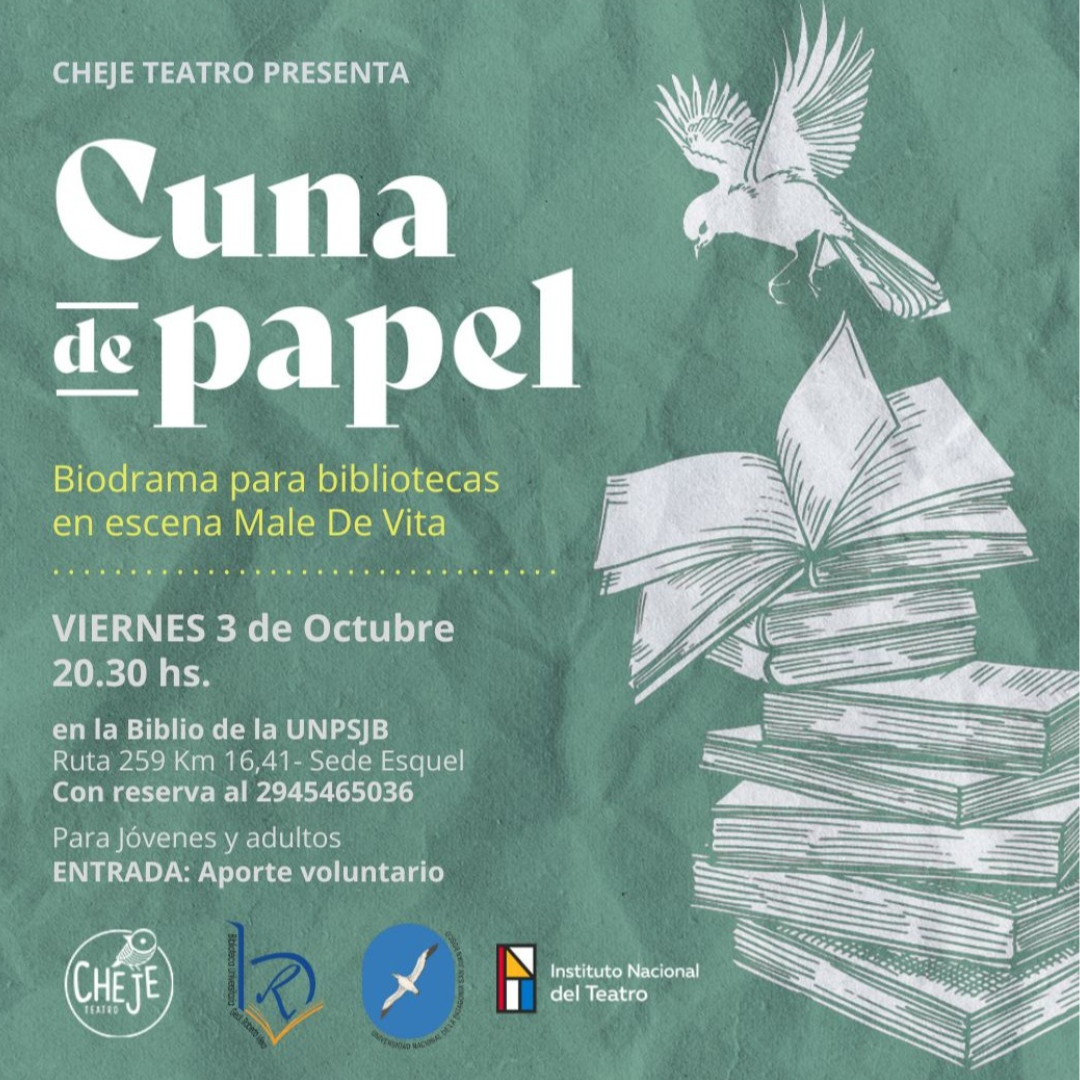 La Biblioteca Geólogo Roberto L. M. Viera de la UNPSJB en su sede de Esquel será el escenario de una experiencia teatral única. El próximo viernes 3 de octubre, a las 20:30, el biodrama "Cuna de papel" llenará de vida los pasillos y estanterías, proponiendo una reflexión sobre los libros, la identidad y la memoria. La obra, protagonizada por Male De Vita y producida por @cheje.teatro, busca transformar la biblioteca en un espacio de acción y fantasía.