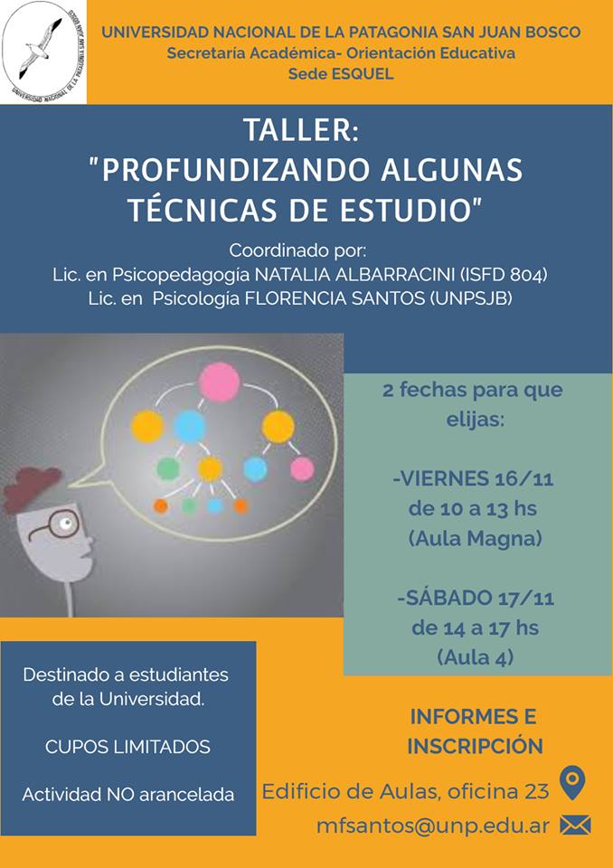 Este viernes y sábado se realizará el taller "Profundizando algunas técnicas de estudio", destinada a estudiantes de la UNPSJB.