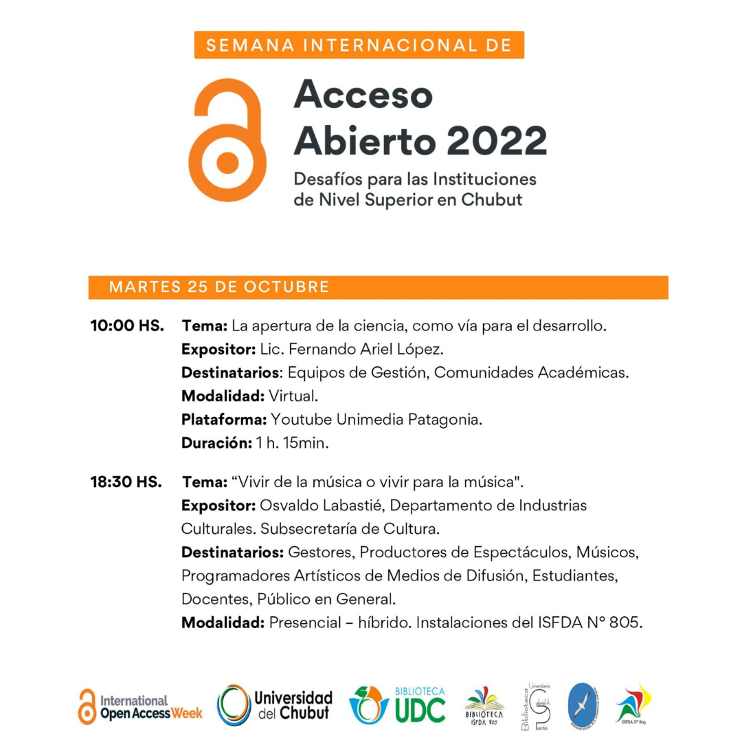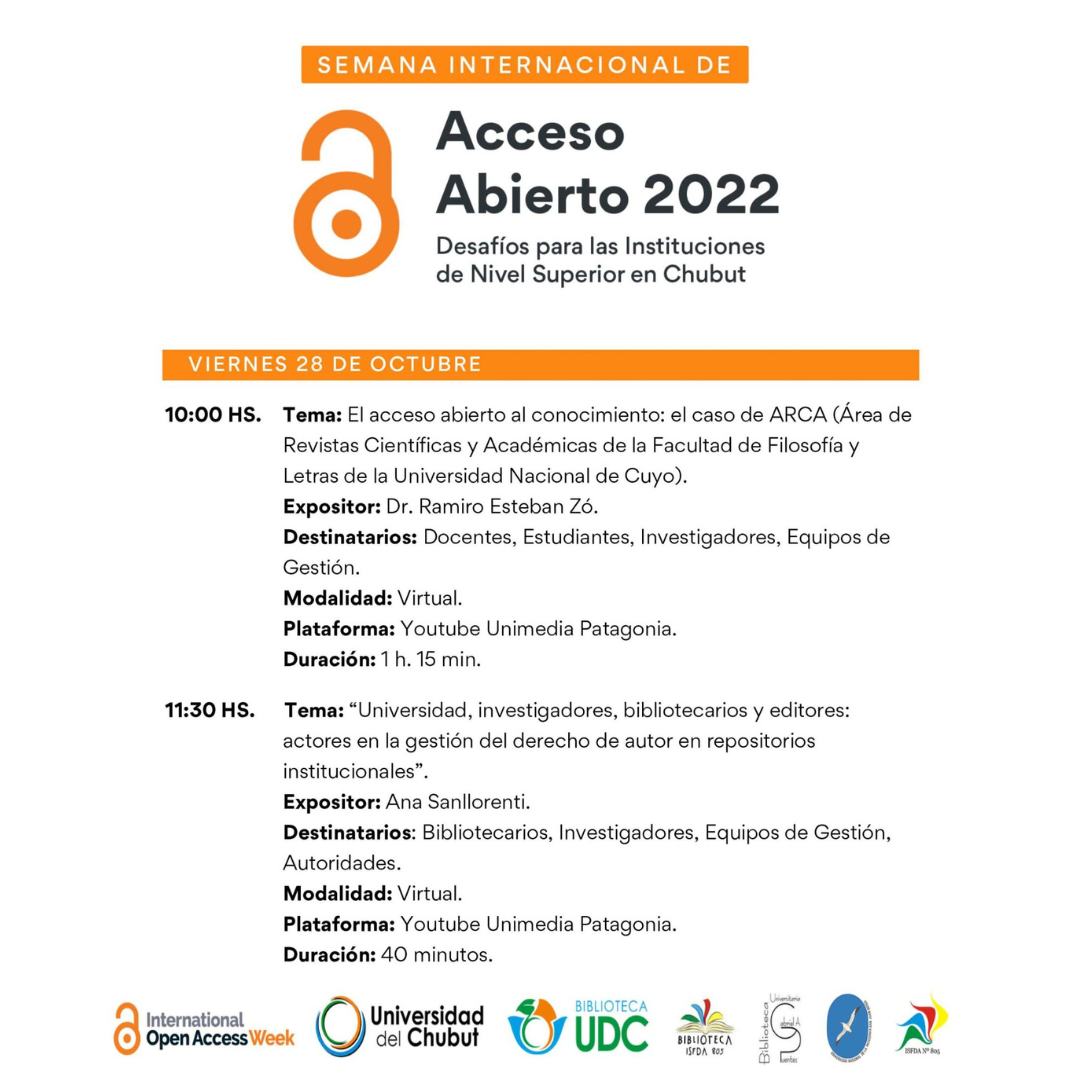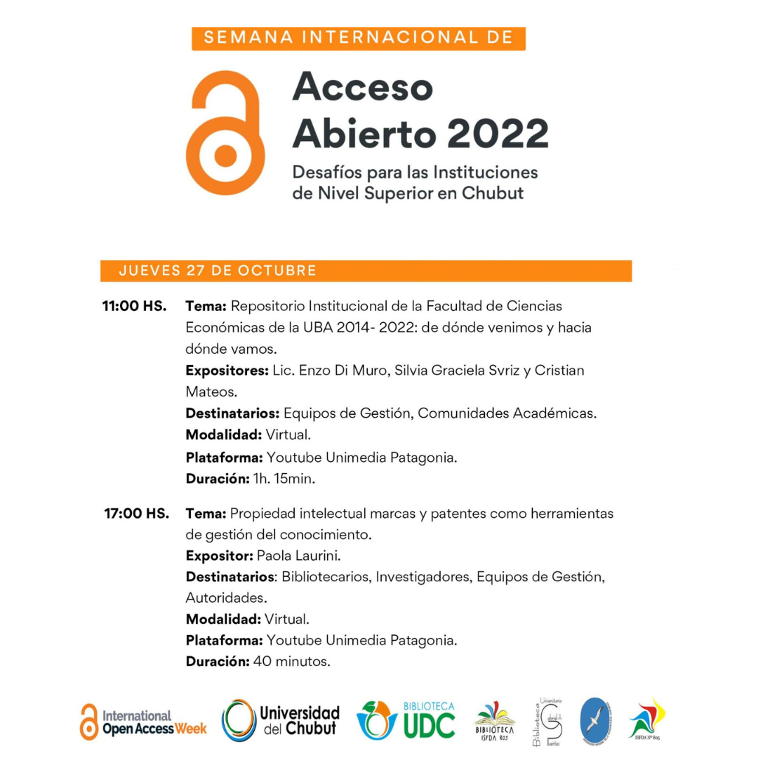La biblioteca Gabriel A. Puentes de la UNPSJB junto a las bibliotecas de la Universidad del Chubut y del ISFDA N° 805 se suman a la Semana Internacional del Acceso Abierto con diversas actividades virtuales y presenciales, de concientización y difusión de la temática en en el ámbito de la enseñanza superior.