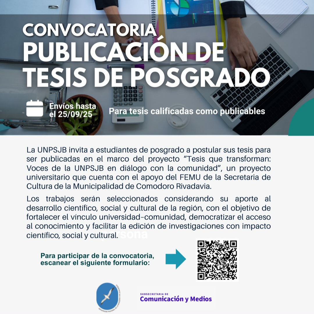 La Universidad Nacional de la Patagonia San Juan Bosco, a través de la Subsecretaria de Comunicación y Medios y con el apoyo del Fondo Editorial Municipal (FEMU) de la Secretaria de Cultura de la Municipalidad de Comodoro Rivadavia, anunció el inicio de la convocatoria: “Tesis que transforman: Voces de la UNPSJB en diálogo con la comunidad”.