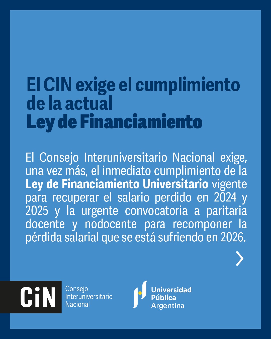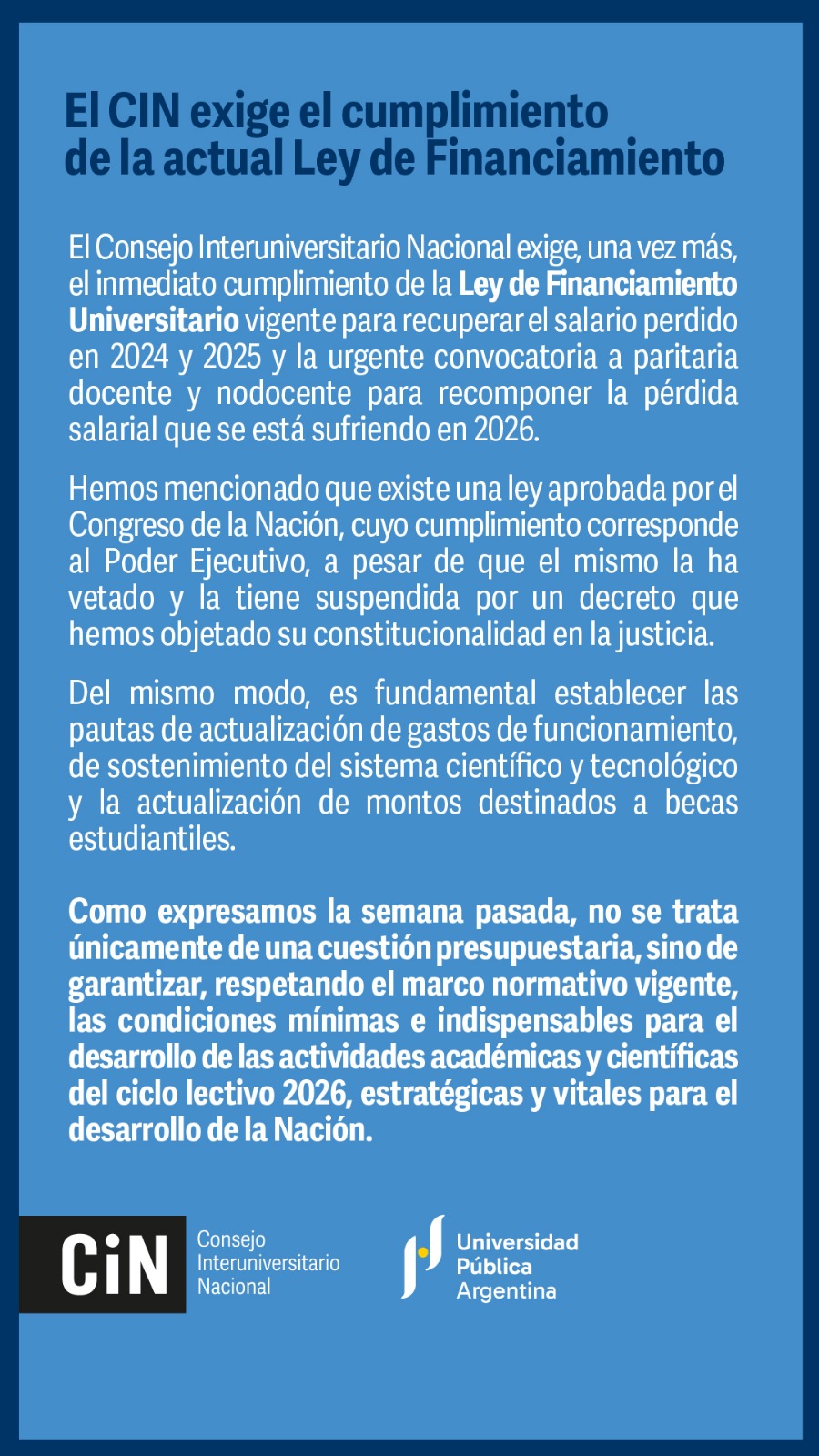 El Consejo Interuniversitario Nacional exige, una vez más, el inmediato cumplimiento de la Ley de Financiamiento Universitario vigente para recuperar el salario perdido en 2024 y 2025 y la urgente convocatoria a paritaria docente y nodocente para recomponer la pérdida salarial que se está sufriendo en 2026.