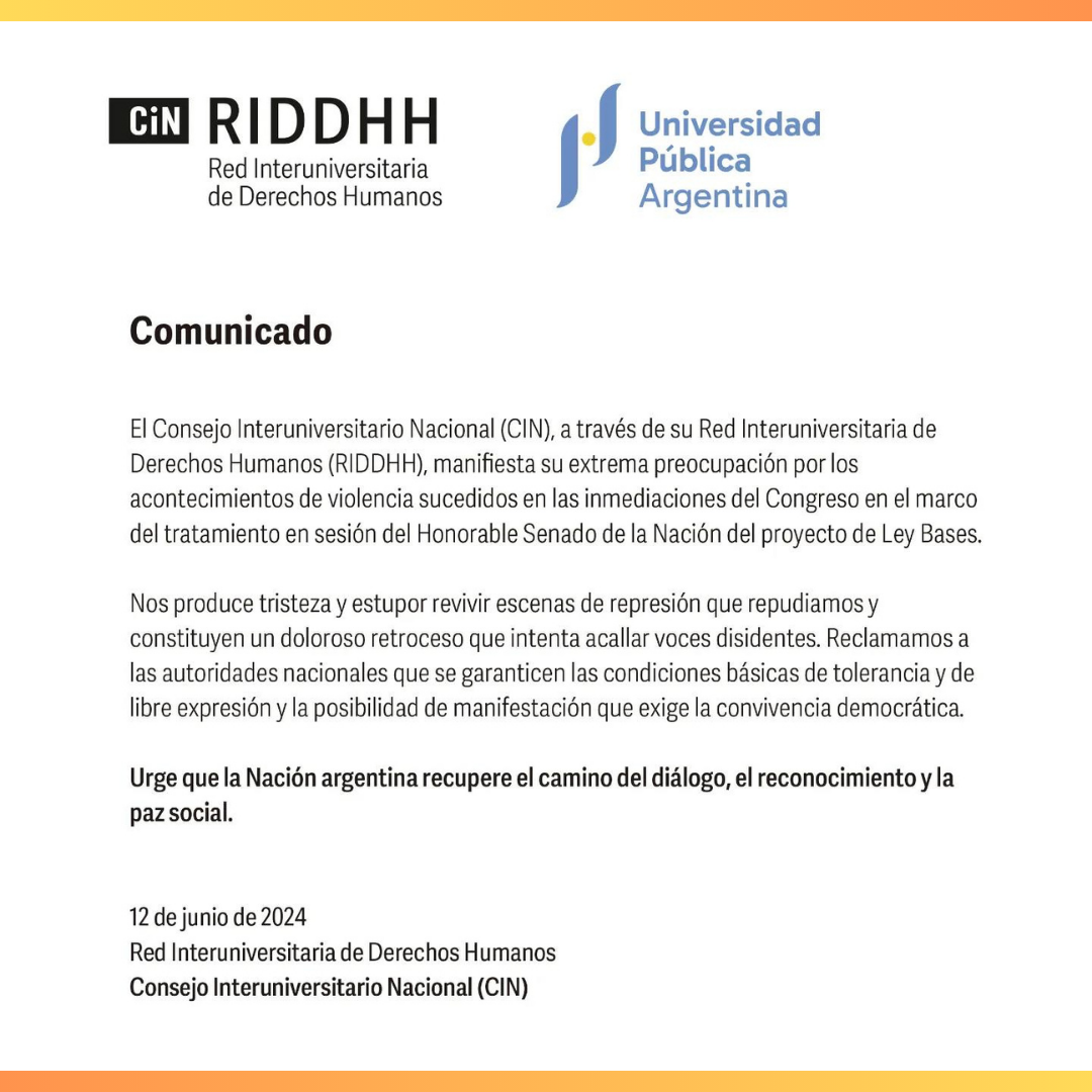 Red Interuniversitaria de Derechos Humanos del CIN (Comunicado) Escrito en 13 Junio 2024. | Publicado en Rectorado Leer más