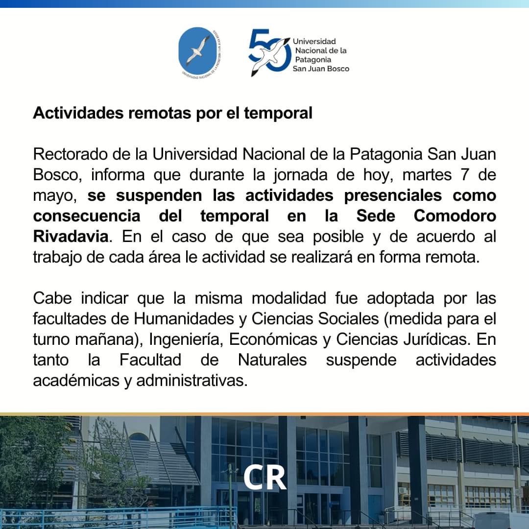 Actividades remotas por el temporal en Comodoro Escrito en 07 Mayo 2024. | Publicado en Rectorado Leer más