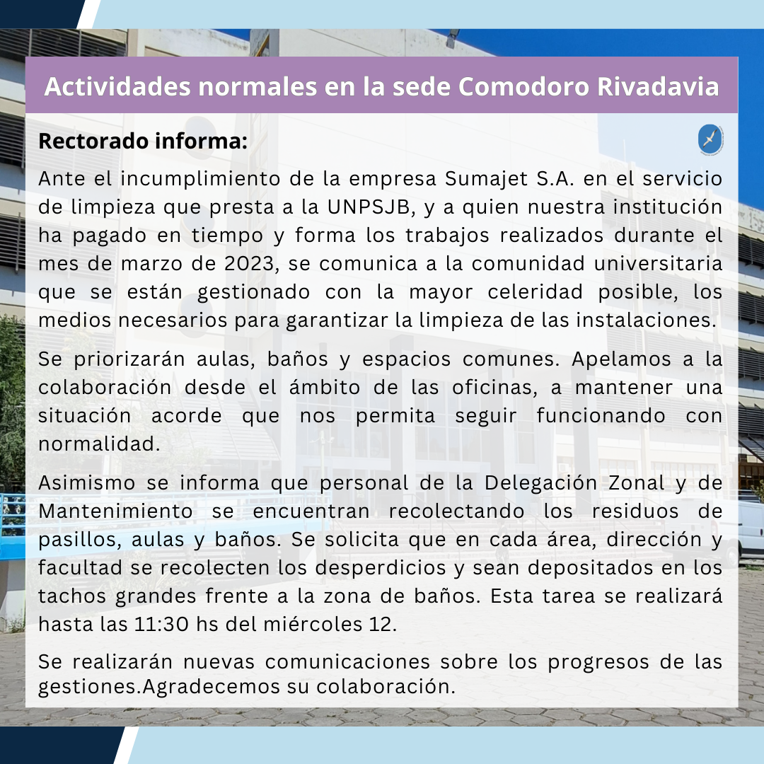 Actividades normales en la sede Comodoro Rivadavia Escrito en 12 Abril 2023. | Publicado en Rectorado Leer más