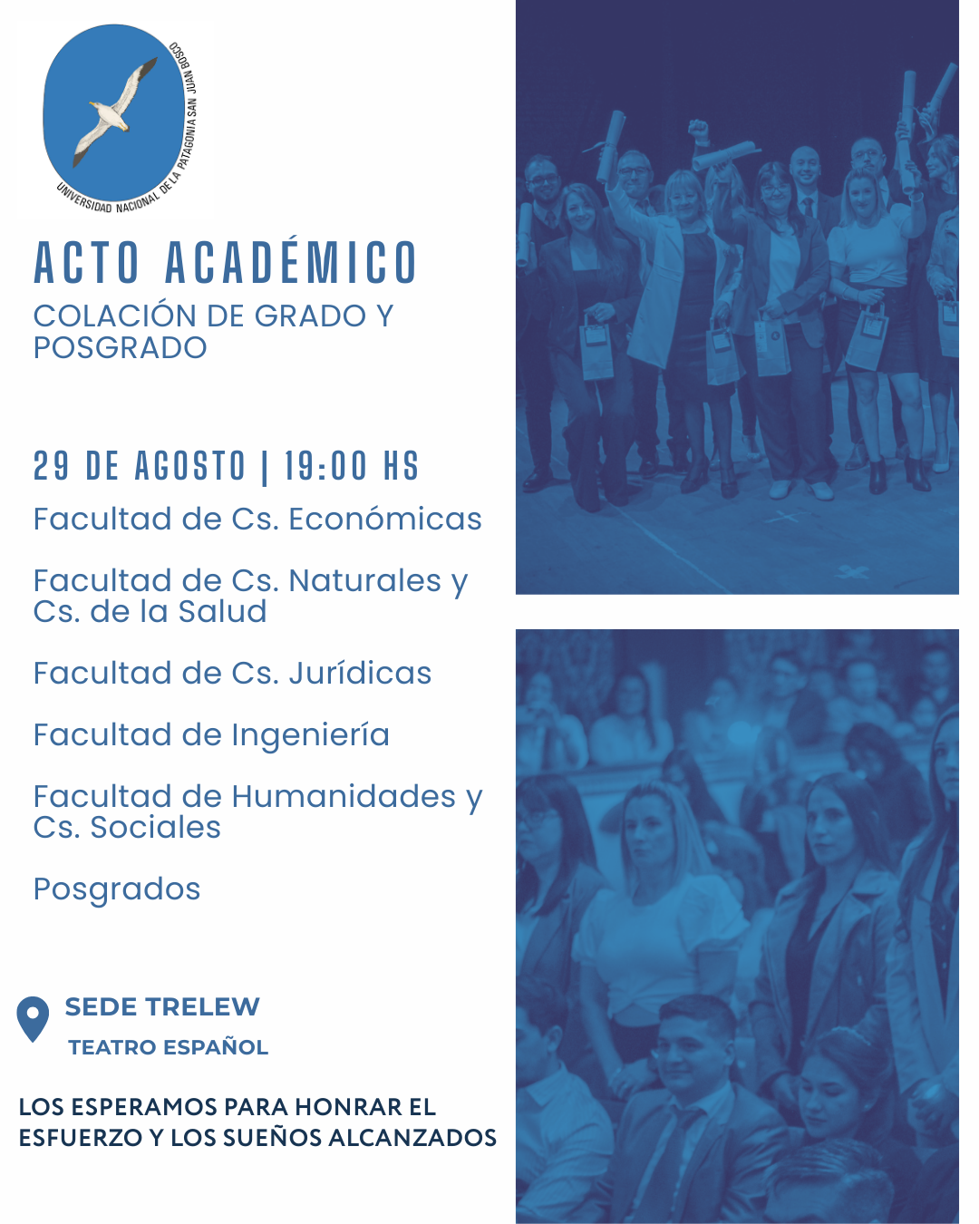 La Señora rectora de la Universidad Nacional de la Patagonia San Juan Bosco, MSc. Antonia Lidia Blanco, tiene el agrado de invitar a usted al Acto Académico de la CXC Colación de Grado, que se realizará el día 12 de septiembre de 2025 a las 15 horas, en el Aula Magna “Prof. Eduardo Cabezas” de la Ciudad Universitaria de km 4, de Comodoro Rivadavia.