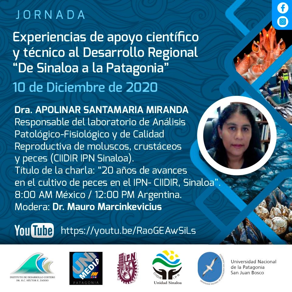 A continuación, la Dra. Apolinar Santamaría Miranda, se referirá a los “20 años de avances en el cultivo de peces en el IPN CIIDIR Sinaloa”. Será a las 12.00 hora Argentina / 8.00 hora de México. El moderador en esta ocasión será el Dr. Mauro Marcinkevicius, (IDC /FCN/FI/UNPSJB).