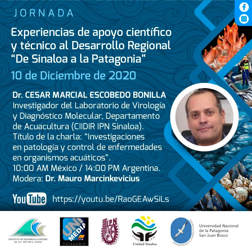 Luego del receso, se espera la presentación del Dr. César Marcial Escobedo Bonilla quien expondrá sobre las “Investigaciones en patología y control de enfermedades en organismos acuáticos”. Será a las 14.00 hora Argentina/ 10.00 hora México. Moderará el Dr. Mauro Marcinkevicius, (IDC /FCN/FI/UNPSJB).