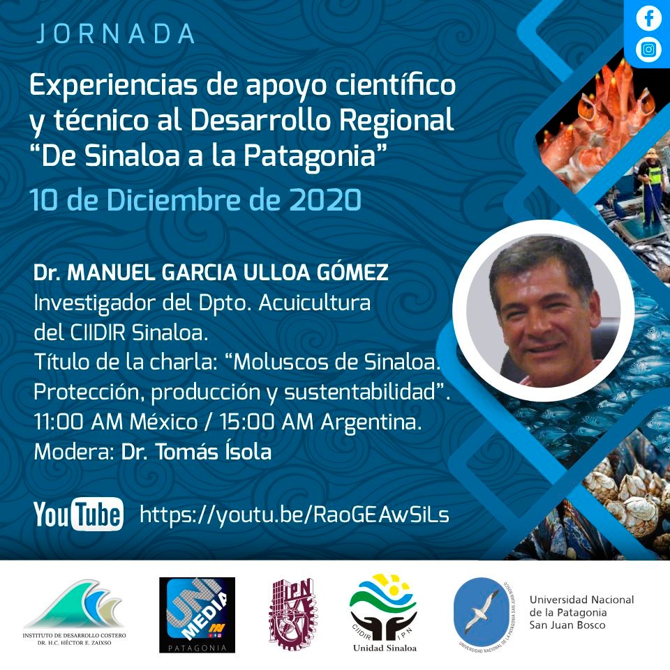 Seguidamente, la exposición del Dr. Manuel García Ulloa Gómez, se denomina “Moluscos de Sinaloa. Protección, producción y sustentabilidad” y tendrá lugar a las 15.00 hora Argentina / 11.00 hora México. El moderador será el Dr. Tomas Isola (IDC/CONICET/FI).