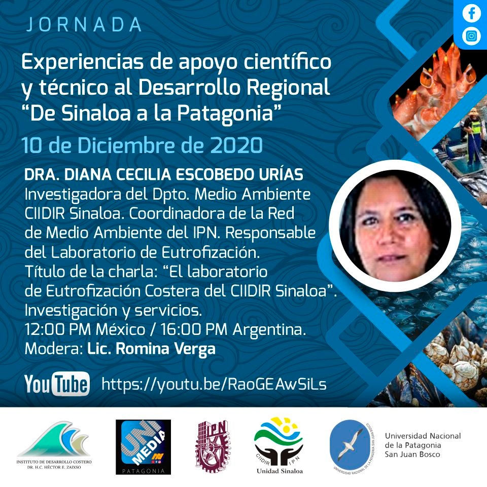 La especialista, Dra. Diana Cecilia Escobedo Urías, comentará la experiencia en “El laboratorio de Eutrofización Costera del CIIDIR Sinaloa. Investigación y servicios. 16.00 hora Argentina/12.00 hora México. Modera la Lic. Romina Verga (IDC UNPSJB).