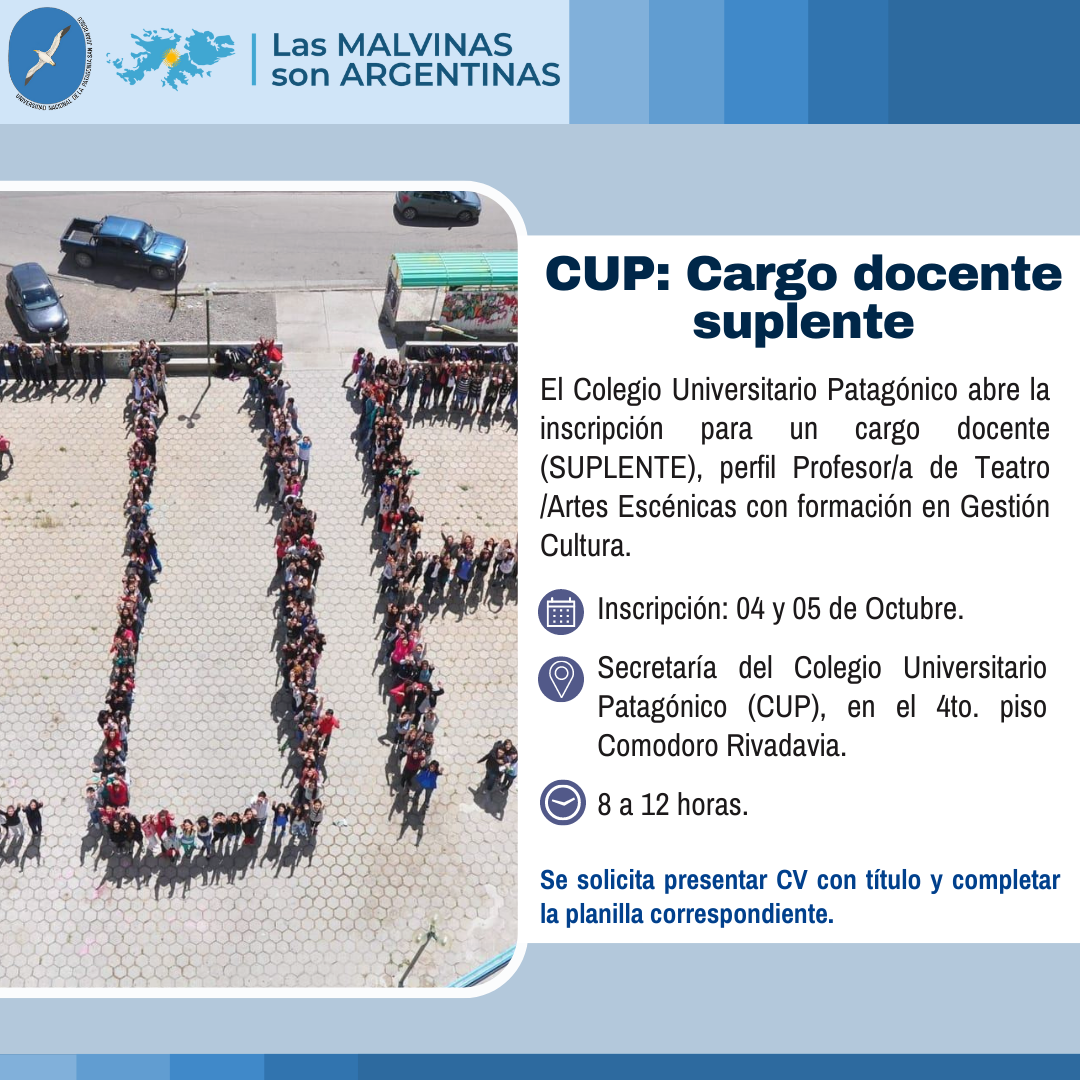 La Universidad Nacional de la Patagonia San Juan Bosco, a través de la Secretaría Académica informa que el Colegio Universitario Patagónico “Prof. Adriana Librandi”, tiene abierta la inscripción para un cargo docente (SUPLENTE), perfil Profesor/a de Teatro /Artes Escénicas con formación en Gestión Cultura.