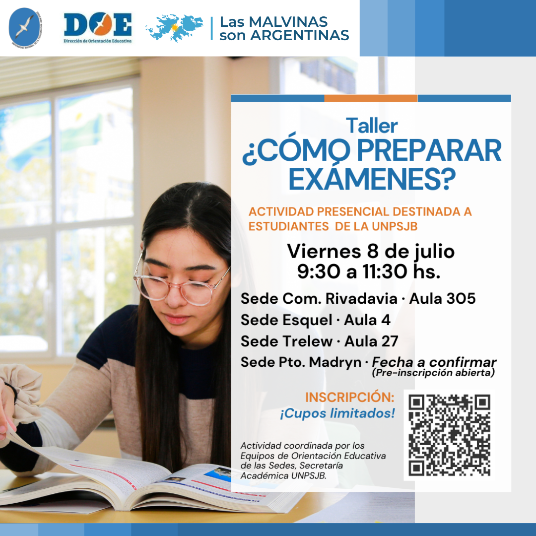 El próximo viernes 8 de julio, los Equipos de Orientación Educativa en las Sedes, brindarán el Taller ¿Cómo preparar exámenes? destinado a estudiantes de la UNPSJB.