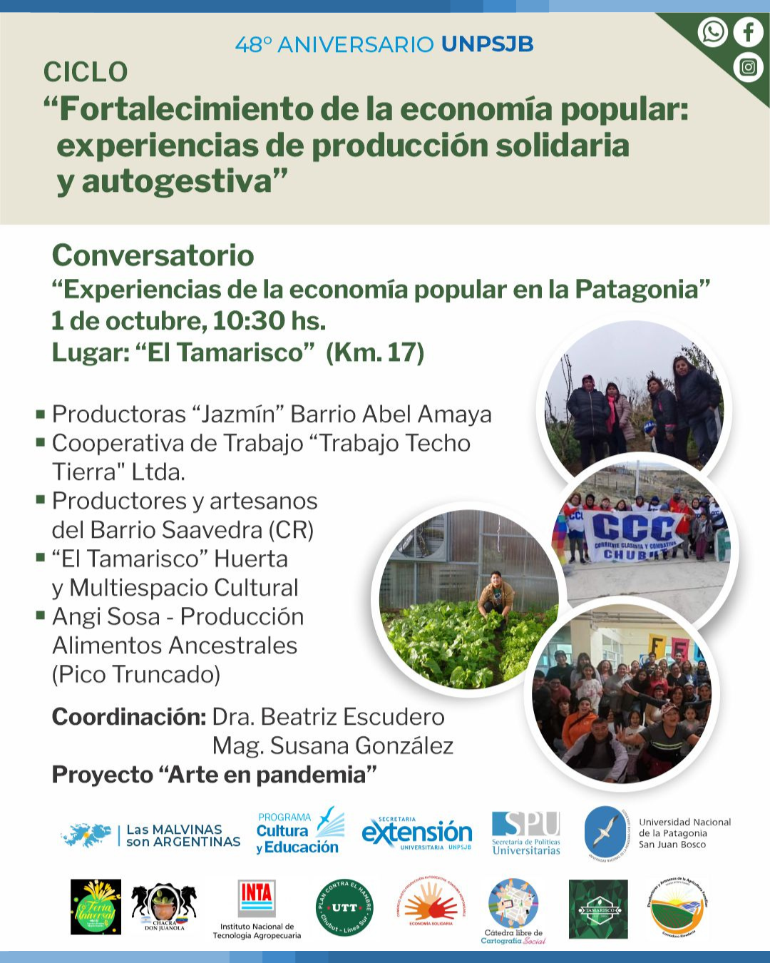 El próximo sábado 1 de octubre, a partir de las 10:30 en El Tamarisco Huerta Familiar y Multiespacio (Km. 14), se realizará el Conversatorio “Experiencias de la economía popular en la Patagonia” donde estarán representadas algunas organizaciones de productores locales y regionales.