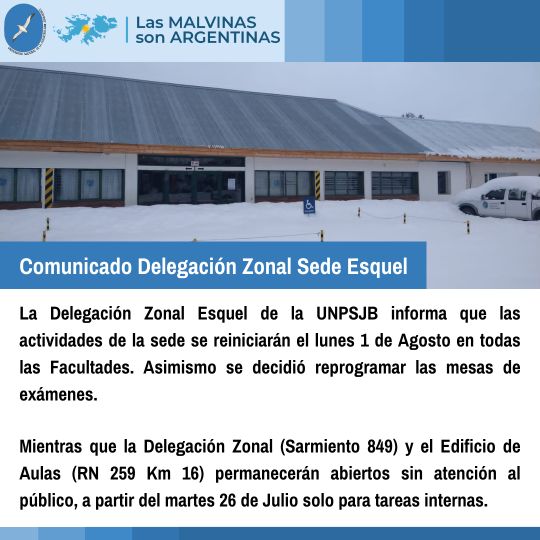 La Delegación Zonal de la Sede Esquel de la Universidad Nacional de la Patagonia San Juan Bosco (UNPSJB) informa que ante las condiciones meteorológicas que afectan la región,