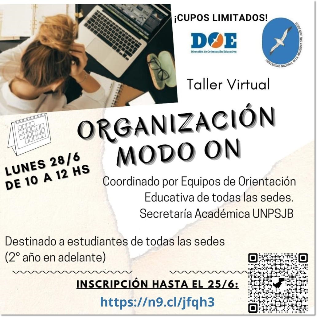 La Dirección de Orientación Educativa, dependiente de la Secretaría Académica de la Universidad Nacional de la Patagonia San Juan Bosco, en trabajo articulado con la Dirección Académica de la Delegación Zonal Sede Trelew y Orientación Educativa de la Delegación Zonal Sede Esquel, invitan al Taller Organización Modo ON...