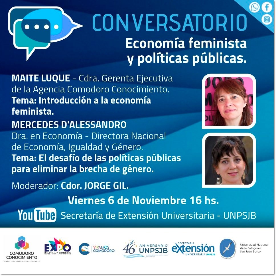 El día viernes 6 de noviembre a las 16 horas, se debatirá sobre el tema: “Economía feminista y políticas públicas” Contando con la presencia de Maite Luque, que es contadora, Diplomada en políticas públicas y actualmente Gerenta de la Agencia Comodoro Conocimiento, junto a Mercedes D'Alessandro que es doctora en economía y Directora Nacional de Economía, Igualdad y Género del Ministerio de Economía.