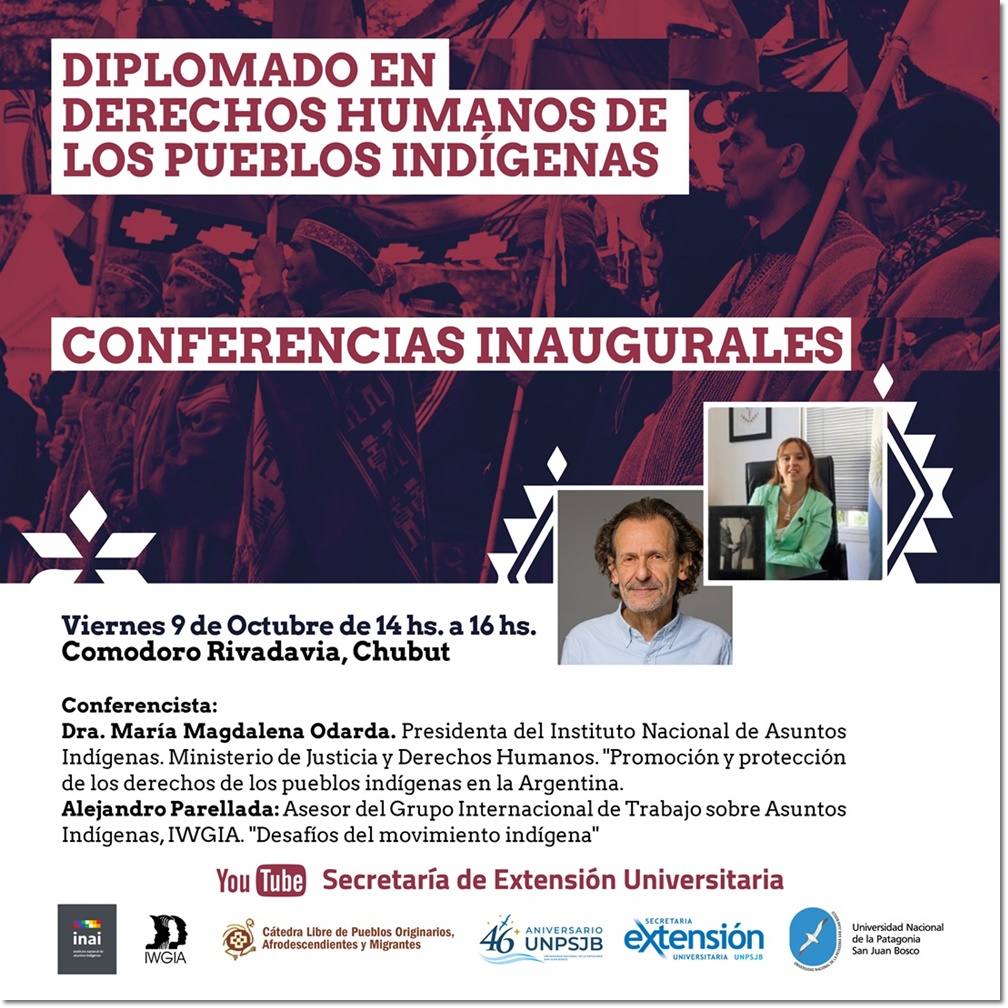 El viernes 9 de octubre, DE 14 A 16 se realizará la Conferencia Inaugural del Diplomado en Derechos Humanos de los Pueblos Indígenas, organizado por la Secretaría de Extensión Universitaria y la Cátedra de Pueblos Originarios, Afrodescendientes y Migrantes.