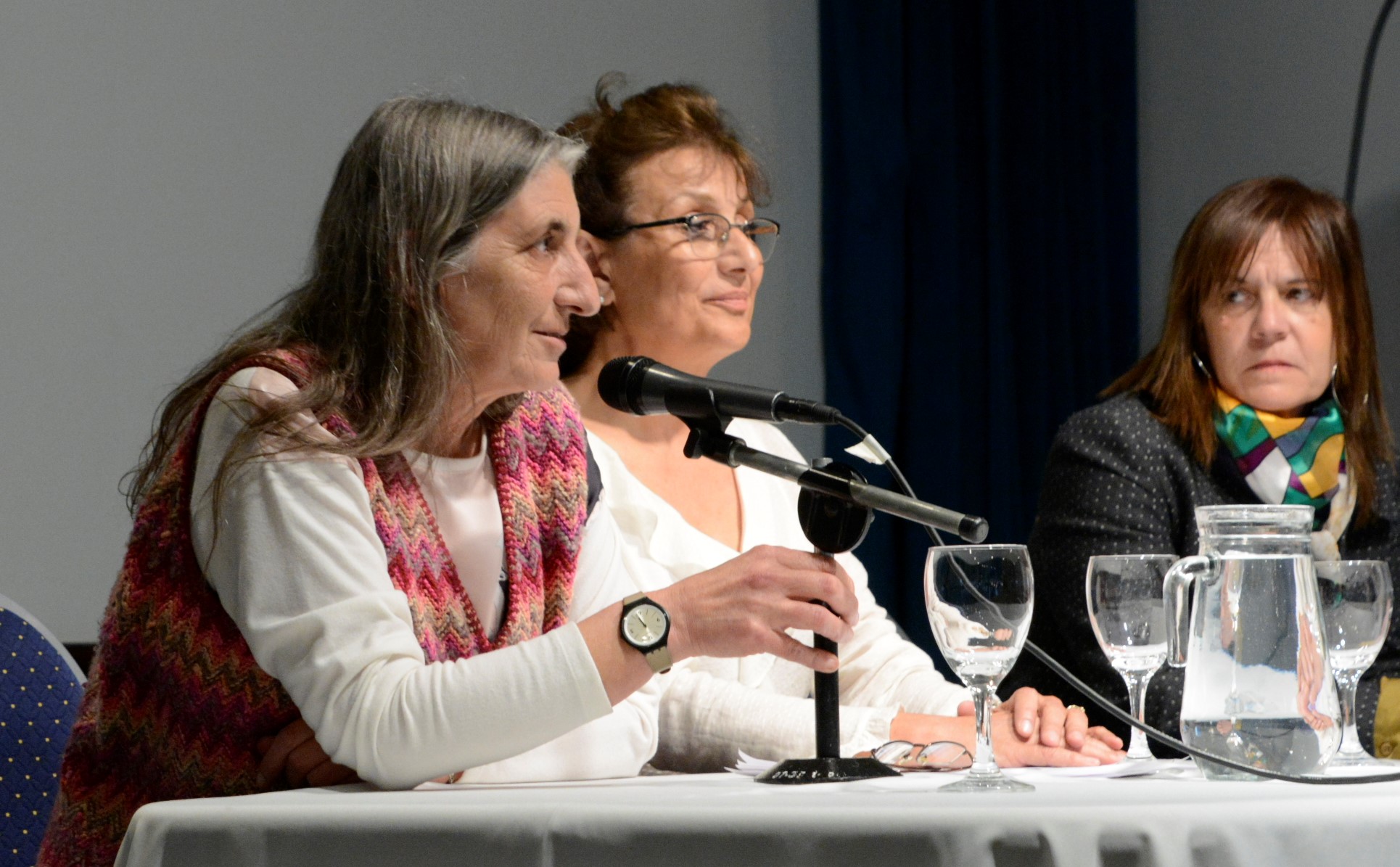 Presentación de las Jornadas/Congreso en el Salón Azul de la UNComa. Palabras de Teresa Vecchia (Depto de Geografía - FaHuma - UNComa); a su izqierda la entoces vicerecctora Dra. Adriana Catalina Caballero; luego la Decana de la Facultad de Humanidades UNComa, Dra. Beatriz Gentile.