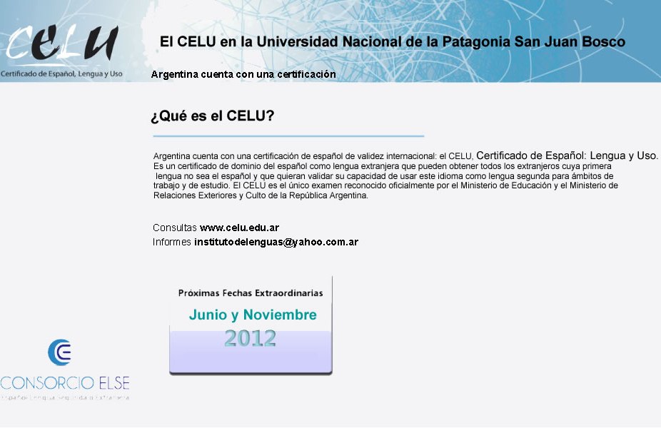 En la ciudad de Comodoro Rivadavia de la Universidad Nacional de la Patagonia San Juan Bosco, se ofrece la posibilidad de obtener un certificado en Español para extranjeros(Instituto de lengua). Para más detalles contactarse la Lic. María Inés Quevedo, e-mail: Esta dirección de correo electrónico está protegida contra spambots. Usted necesita tener Javascript activado para poder verla.