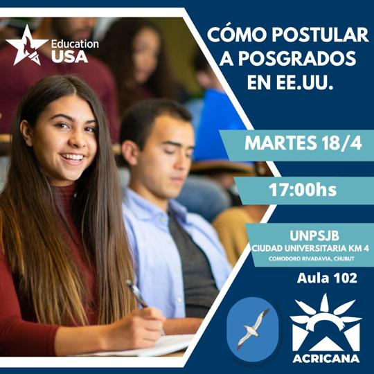 La Oficina de Relaciones Internacionales invita a la charla "Cómo postular a Posgrados en EE.UU." organizada por Acricana, sobre carreras de postgrado en los Estados Unidos de Norte América. Esta charla está programada para el día martes 18 de abril a las 17hs., en el Aula 102 -1º piso de la Ciudad Universitaria de Km.4- en Comodoro Rivadavia.