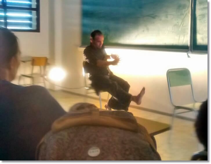 Esta actividad se llevó a cabo utilizando de forma no convencional diferentes espacios del edificio universitario. Consistió en cuatro escenas, interpretadas cada una por un actor diferente, y una complementaria que se fue desarrollando en el pasillo de la universidad. Al finalizar cada acto, un personaje era el encargado de tocar una campana para invitar a los espectadores a trasladarse hacia otro espacio.