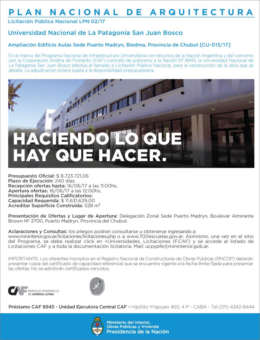 En el marco del Programa Nacional de Infraestructura Universitaria con recursos de la Nación Argentina y del convenio con la Corporación Andina de Fomento (CAF) contrato de préstamo a la Nación N° 8945, la Universidad Nacional de la Patagonia San Juan Bosco efectúa el llamado a Licitación Pública Nacional, para la construcción de la obra que se detalla. La adjudicación estará sujeta a la disponibilidad presupuestaria.