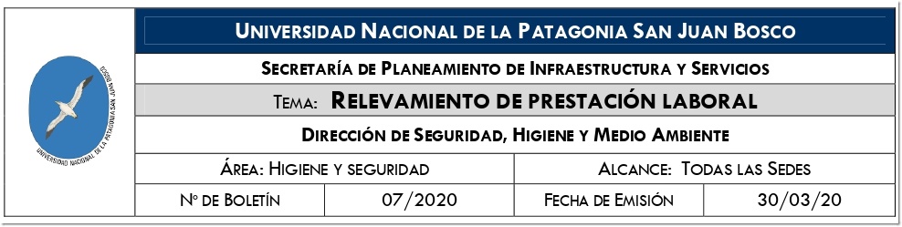 La Universidad Nacional de la Patagonia San Juan Bosco, informa a todo su personal, que se encuentra habilitado el formulario obligatorio donde deberán registrar la Prestación Laboral en Domicilio o Teletrabajo, o en su defecto la Prestación de Servicio en el Ámbito Laboral Declarado. Esta información está dirigida al personal de todas las Sedes Universitarias. Ante cualquier consulta enviar correo electrónico a Esta dirección de correo electrónico está protegida contra spambots. Usted necesita tener Javascript activado para poder verla. perteneciente a la Dirección de Seguridad, Higiene y Medio Ambiente que depende de la Secretaría de Planeamiento, de Infraestructura y Servicios.