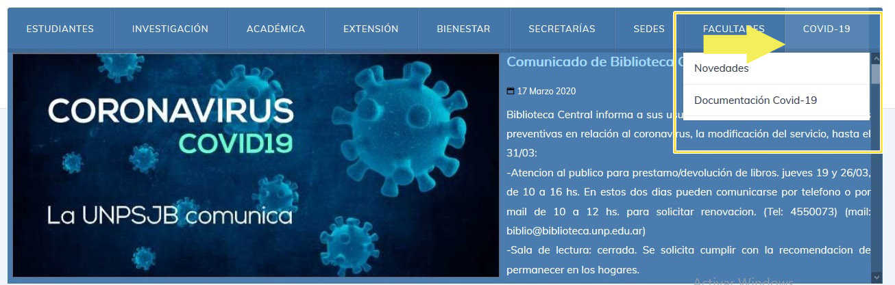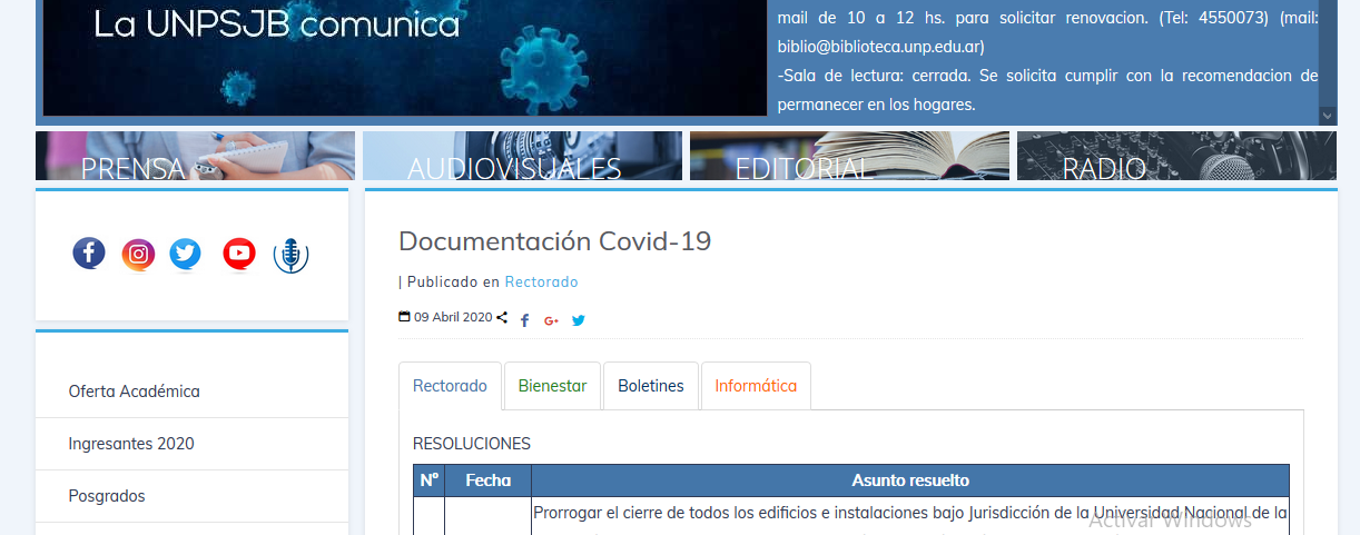 El mismo, resume las novedades así como las acciones institucionales desarrolladas en los diferentes ámbitos. Posee además una sección "Documentación", que recaba la normativa más importante resuelta para atender la actual situación de emergencia, por ese motivo, se recomienda a la comunidad universitaria, revisar frecuentemente estos sitios para mantener un canal de diálogo fluido sobre las últimas acciones en ejecución.