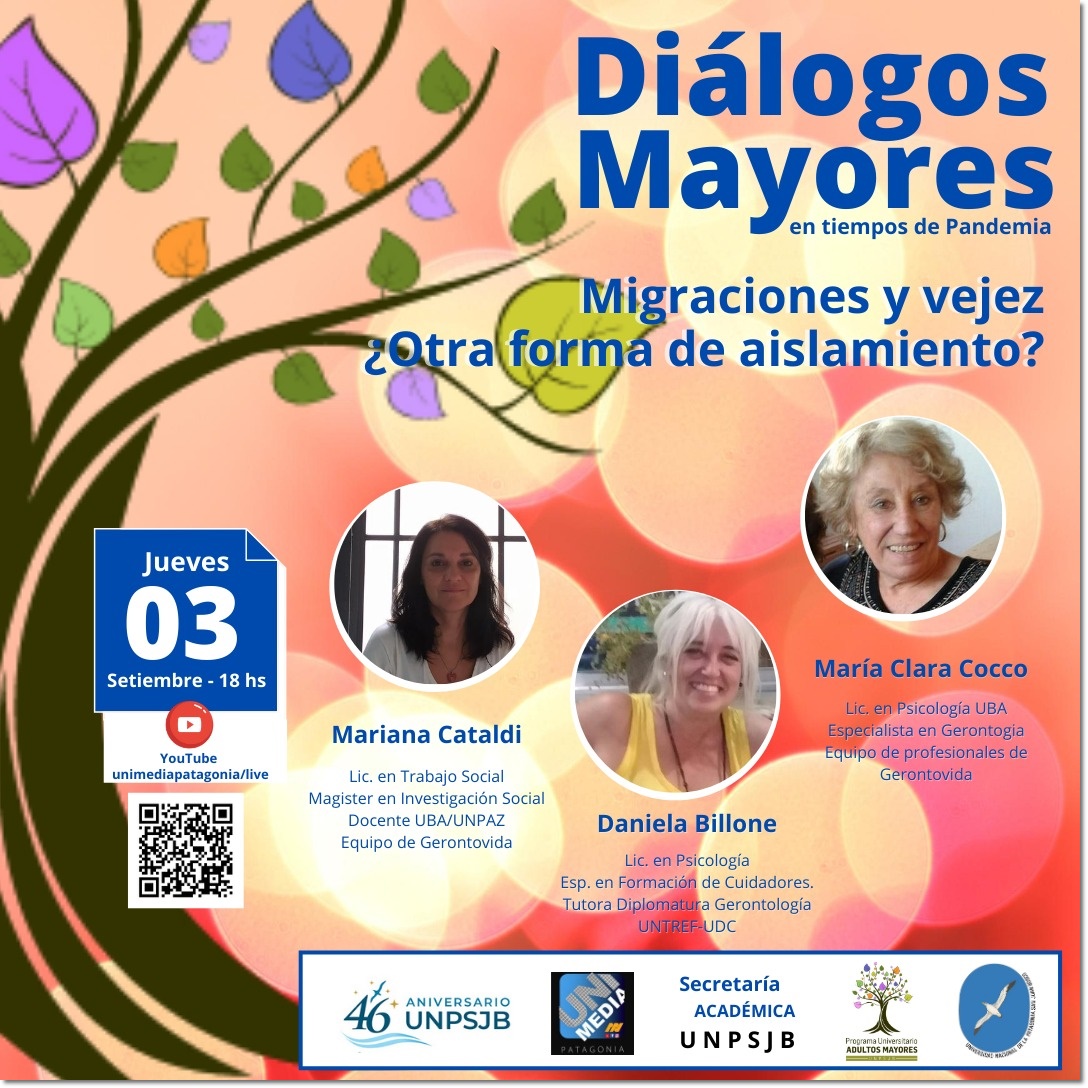 La Secretaría Académica y el Programa de Adultos Mayores de la UNPSJB, invitan a participar de un nuevo encuentro de Diálogos Mayores en tiempos de pandemia. El tema convocante abordará "Migraciones y vejez ¿Otra forma de aislamiento?".