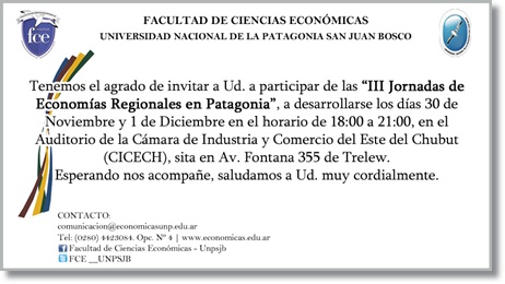 Los próximos 30 de noviembre y 1 de diciembre de 2017 se realizarán en Trelew las III Jornadas de Economías Regionales en Patagonia, organizadas desde la Facultad de Ciencias Económicas de la Universidad Nacional de la Patagonia San Juan Bosco y que tendrán lugar en el Auditorio de la Cámara de Industria y Comercio del Este del Chubut (CICECH) ubicada en Fontana 355 de esta ciudad.