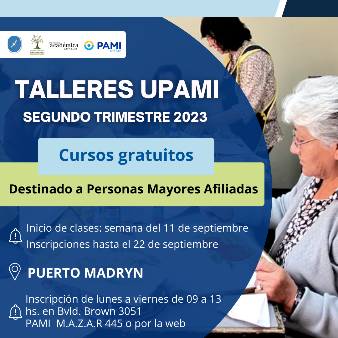 La inscripción se extiende hasta el 22 de septiembre. Se puede realizar en la página www.pami.org.ar/talleresycursos/cursos-upami o personalmente en todas las sedes de la UNPSJB. A continuación, detalle por sede.