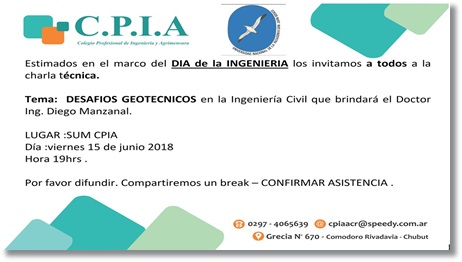 El Dpto de Ing Civil(sede CR) de la Facultad de Ingeniería de la UNPSJB y el Colegio de Profesionales de Ingeniería y Agrimensura CPIA les hacen llegar la invitación a compartir una charla Técnica que brindará el Dr.Ing.Diego Manzanal : Desafíos Geotécnicos en la Ingeniería Civil en el marco de celebrarse el Día de la Ingeniería.