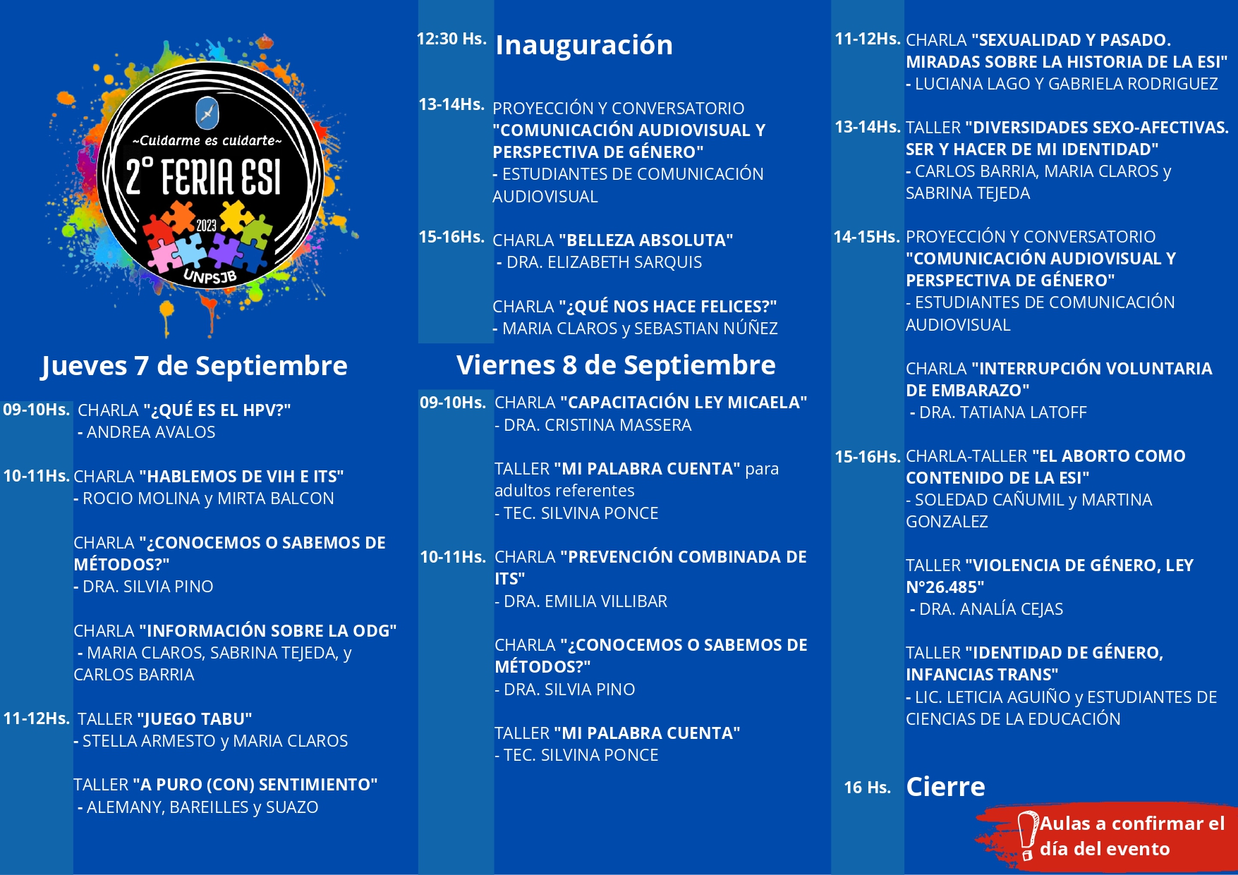 Cronograma de actividades de la 2º Feria ESI de Educación Sexual Integral. Hoy 07 de septiembre comienzan las actividades del primer día de la feria.