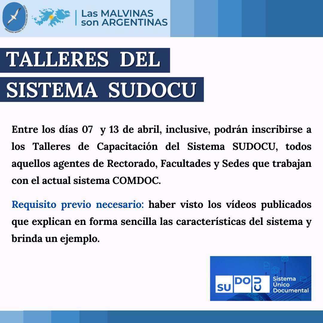 La Dirección General de Despacho y Dirección de Informática informan que entre los días 07 de abril y hasta el 13 de abril 2022, inclusive, podrán inscribirse a los Talleres de Capacitación del Sistema SUDOCU, todos aquellos agentes de Rectorado, Facultades y Sedes que trabajan con el actual sistema COMDOC completando el formulario de inscripción en el siguiente enlace: https://forms.gle/ADgabg9aNxj5Qpvv9