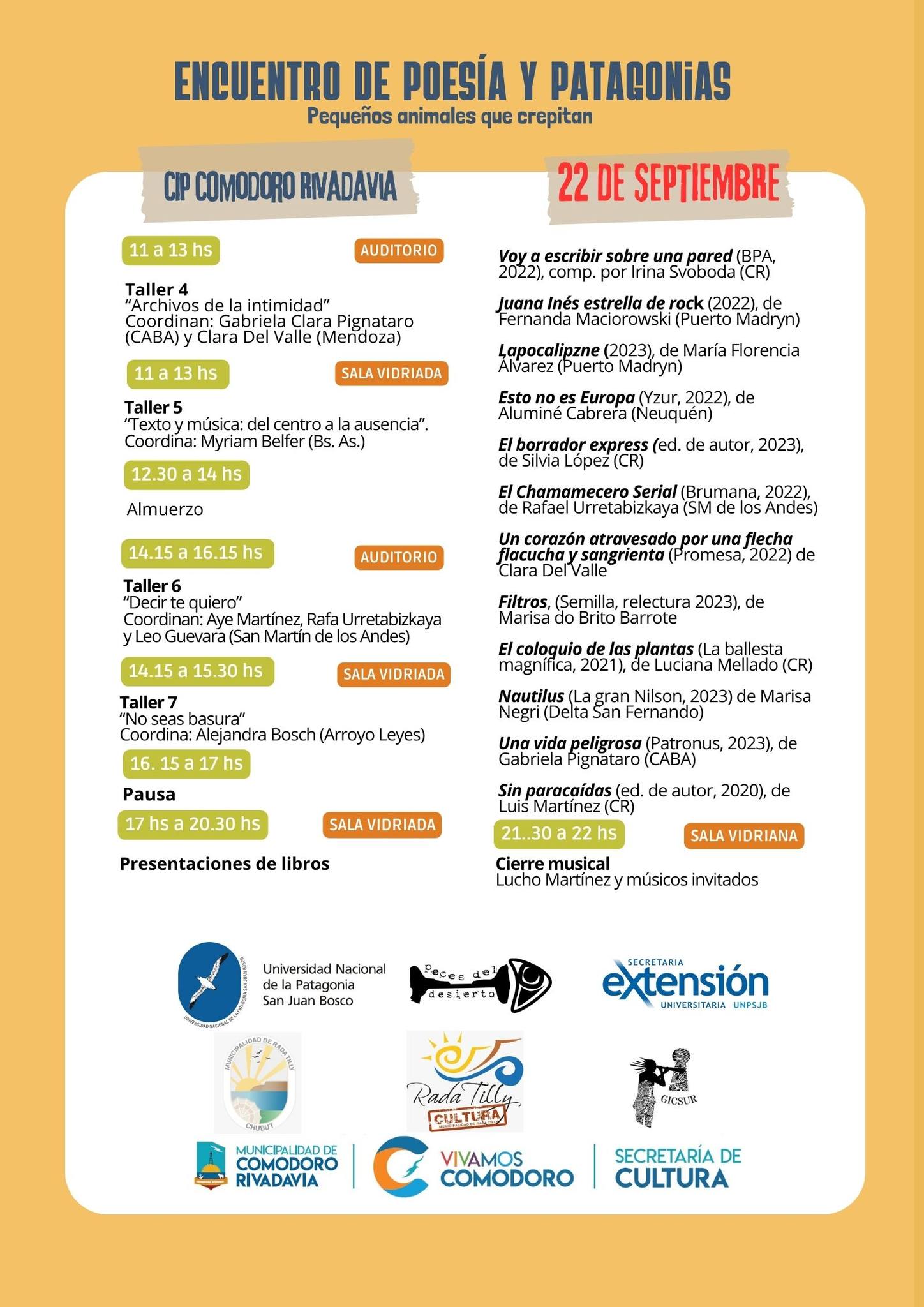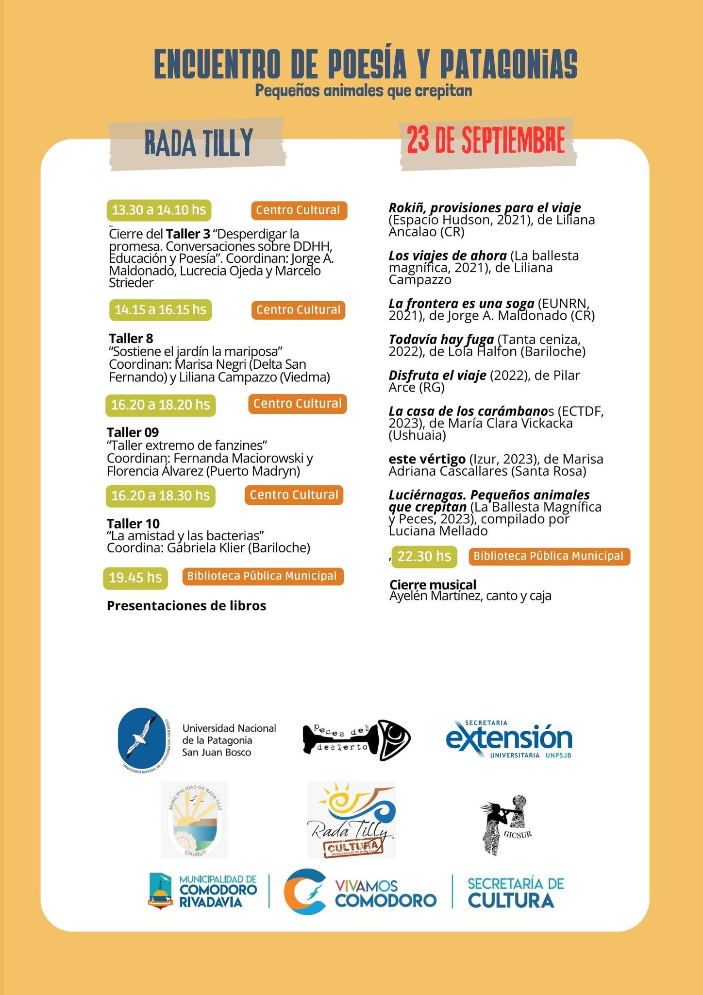 Los talleres, coordinados por poetas, docentes, artistas visuales, actrices y músicas de la Patagonia y de otras provincias del país, tienen inscripción previa.