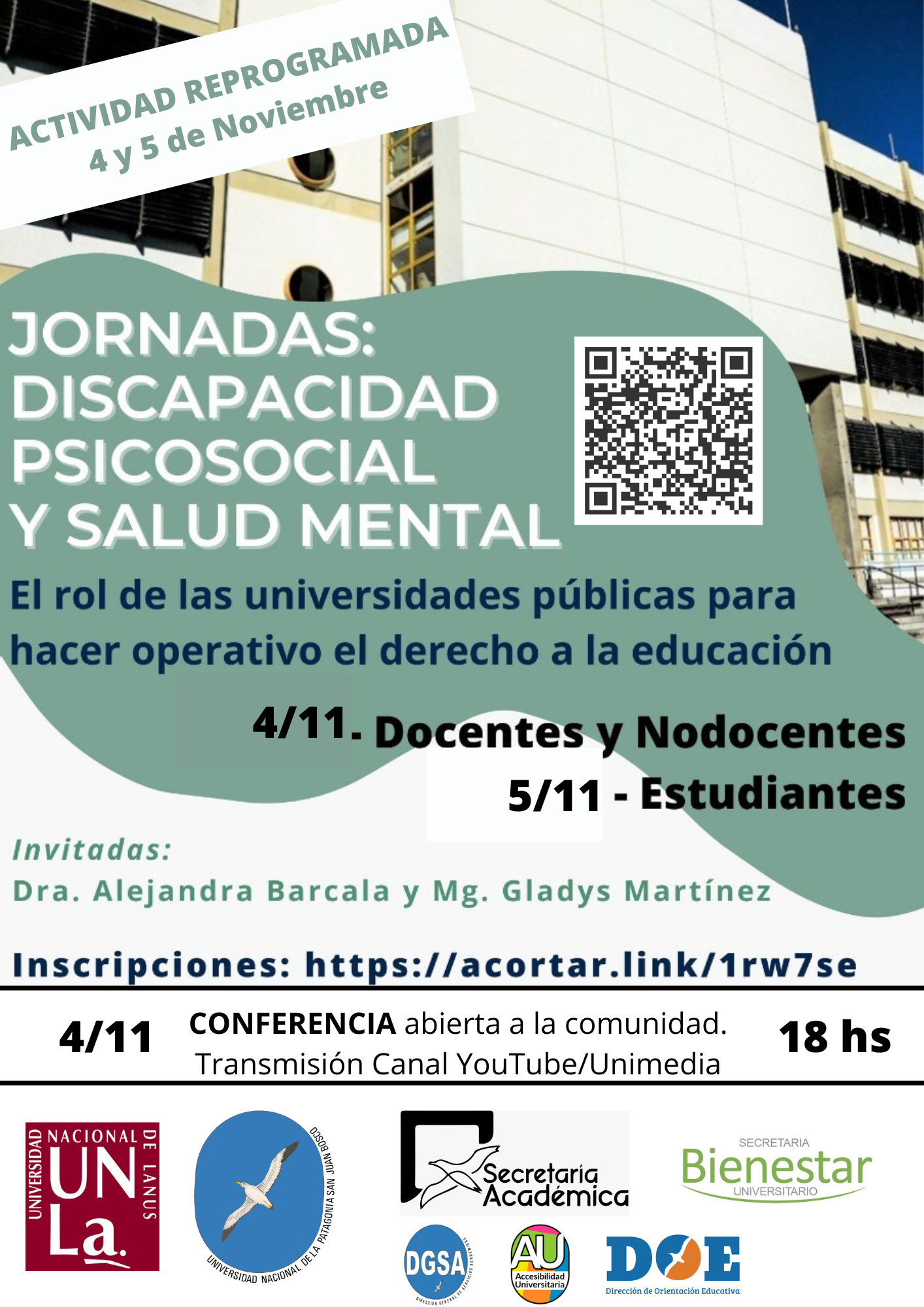 El 4 y 5 de noviembre se realizarán las Jornadas “Discapacidad psicosocial y salud mental: el rol de las Universidades Públicas para hacer operativo el derecho a la educación”. Las actividades están dirigidas a docentes, no docentes y estudiantes. La actividad contará con la presencia de las docentes invitadas, Alejandra Barcala y Gladys Martínez.